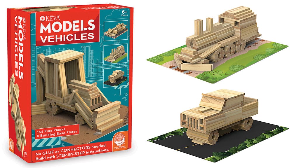 Djeca mogu izgraditi četiri različita drvena vozila – parnu lokomotivu, bager, trkaći automobil i kamion s ravnom platformom – od više mint 150 precizno izrezanih KEVA građevinskih elemekata. Nisu potrebni ljepilo ni spojnice. Ovaj STEM-prijateljski set sadrži osnovne ploče i priručnik koji potiče kritičko razmišljanje i kreativnost dok djeca grade, rastavljaju i ponovno stvaraju, pružajući sate opipljive zabave. Set razvija finu motoriku, sposobnost rješavanja problema i prostorno razmišljanje, dok se djeca kroz igru upoznaju s osnovama inženjerstva i kreativnog dizajna.