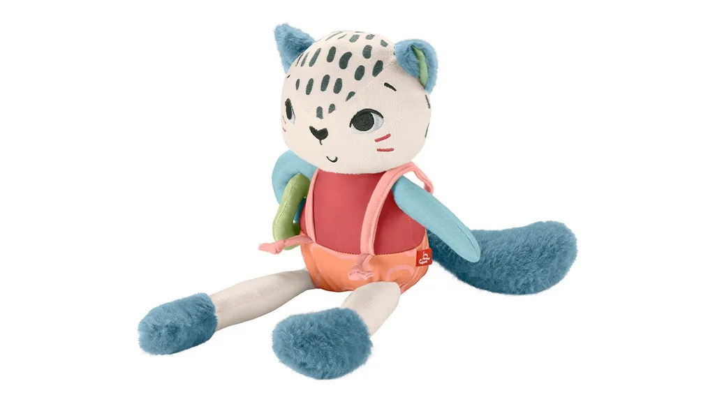 Ova šarena plišana leoparda s cvrčavim čizmama, podesivim nogama, odvojivim naramenicama i prstenom za vuču dolazi. Igračka je izrađena od 95% reciklirane plastike i može se prati u stroju.Knjiga "Spotting Fun Snow Leopard" puna je aktivnosti za najmlađe. Djeca mogu pomicati noge, zveckati stopalima i osjećati meke, svilenkaste materijale.