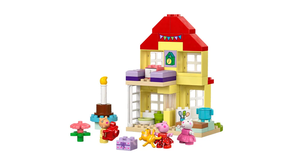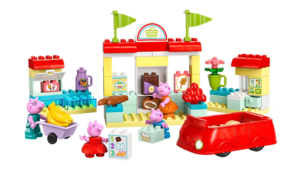 Za još veći LEGO set, Peppa Pig Rođendanska Kuća nudi 59 dijelova zabave na temu rođendana. U setu su uključeni Peppa i njezini prijatelji, Suzy i Pedro, spremni za otvaranje poklona i puhanje rođendanskih svjećica. Peppa Pig Supermarket set ima najviše dijelova među paketima, ukupno 63 dijela. Set sadrži automobil, kolica za kupovinu, popis za kupovinu, razne prehrambene proizvode i još mnogo toga.