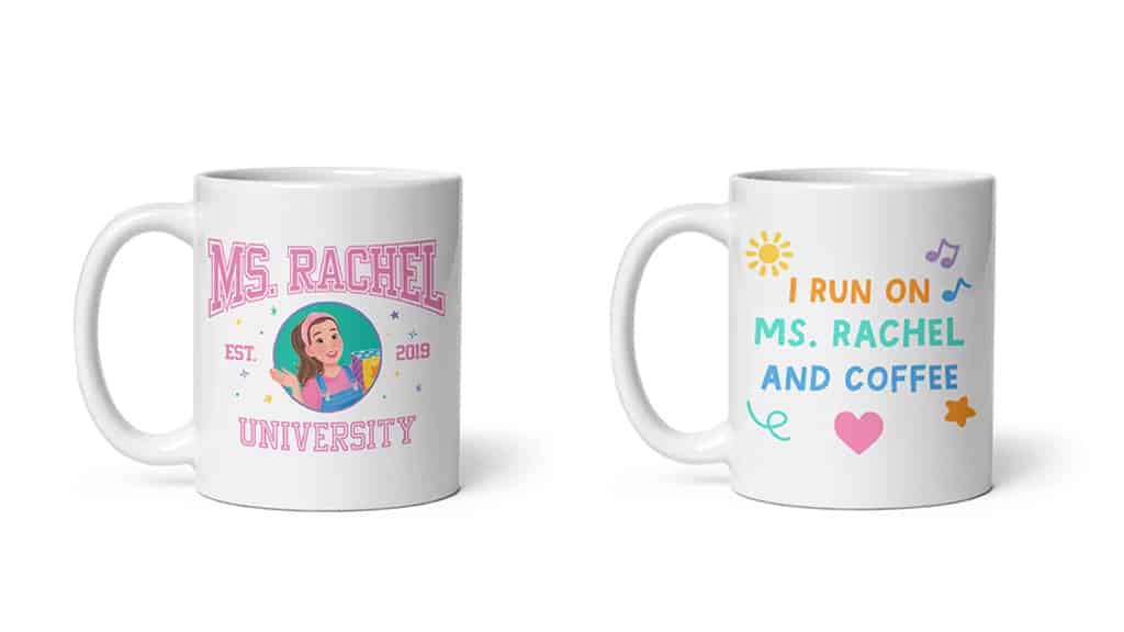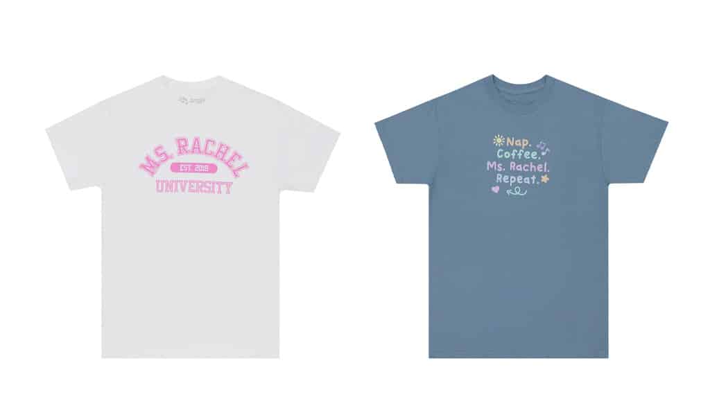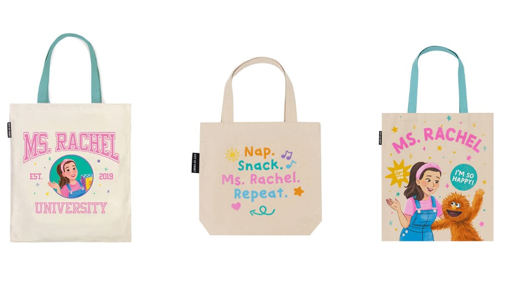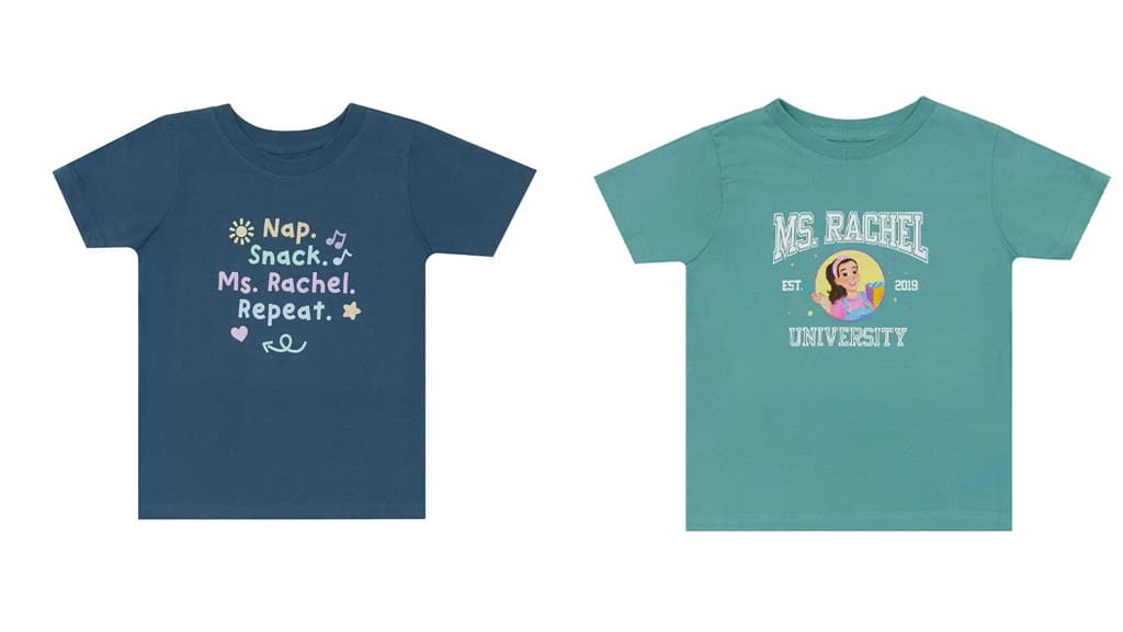 Ako vaša obitelj zajedno gleda Ms. Rachel, možete zajedno osvježiti i svoju garderobu! Kolekcija Out of Print Ms. Rachel sadrži majice, dječju odjeću, torbe, šalice za kavu i još mnogo toga za sve koji su istinski sretni!