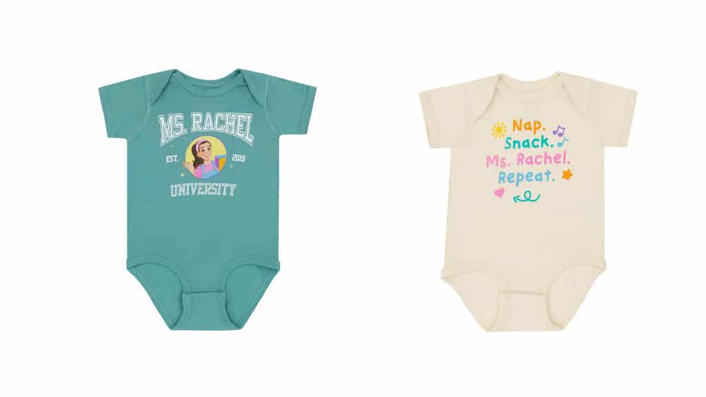 Dva dječja bodija i tri dječje majice dostupni su za vaše dijete. Ovi odjevni predmeti izrađeni su od 100% pamuka i sadrže slike animirane gđe. Rachel (kao što se vidi u njezinoj novoj slikovnici). Na odjeći se nalaze izrazi poput "Ja sam sjajno dijete", "Spavanje. Grickalice. Gđa. Rachel. Ponavljanje" i "Sveučilište gđe. Rachel". Majice i bodiji ukrašeni su šarenim ikonama poput zvijezda, glazbenih nota, točkica i još mnogo toga!