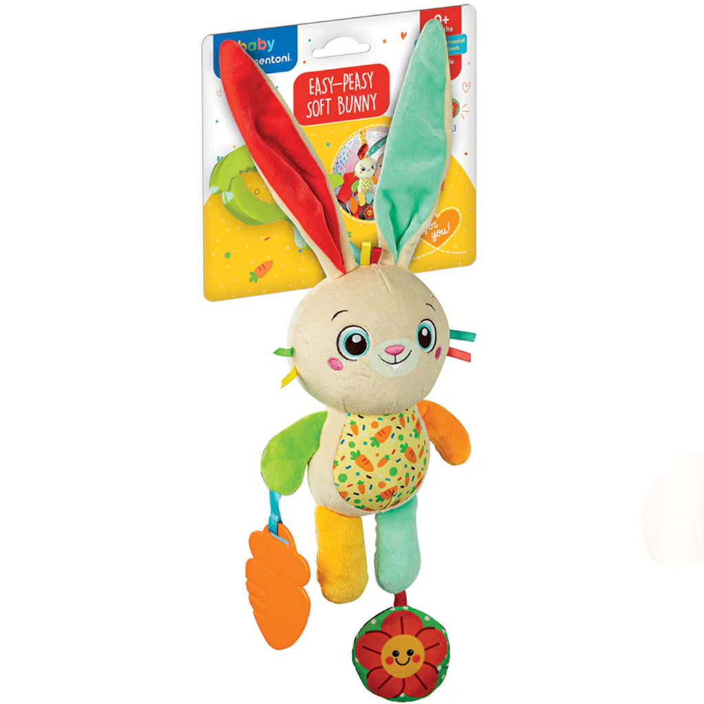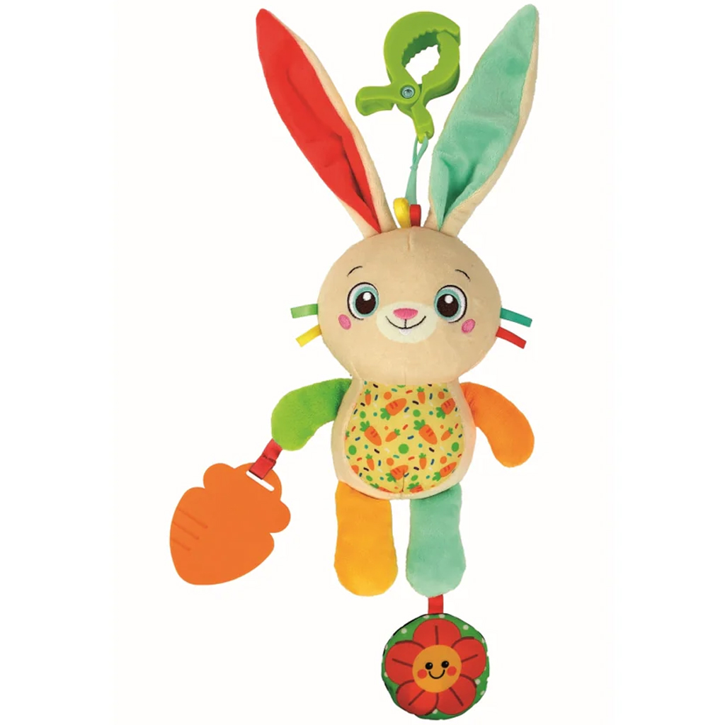 On the go plišani zeko savršen je pratitelj za najmlađe, bilo da se radi o šetnji, putovanju ili čak kratkoj kupovini. Šarmantni šareni zečić prikazan na slici izrađen je od mekog materijala, pa ga dijete može sigurno grliti, a pruža i umirujući osjećaj. Duge uši, razne teksture i veseli, viseći dodaci – poput mrkve i cvijeta – tijekom igre potiču razvoj osjeta i fine motorike. Praktičnom kopčom lako ga možeš pričvrstiti na dječja kolica, autosjedalicu ili krevetić, pa će uvijek biti pri ruci.
