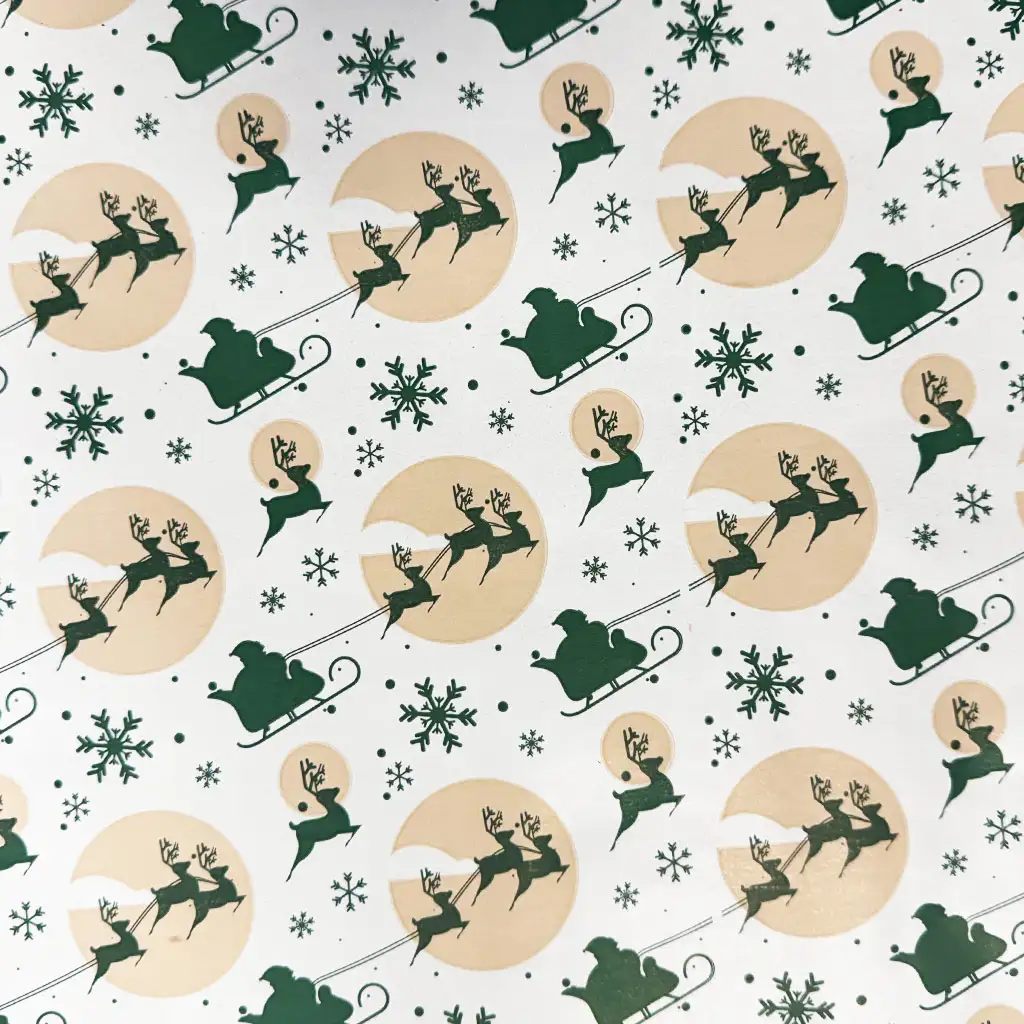 Pretvorite darivanje u čarobnu noćnu avanturu s ovim posebnim omotnim papirom "Santa’s Sleigh Ride"! Na klasičnom blagdanskom uzorku Djed Mrazove saonice lete ispred punog mjeseca u zamahu kojeg vuku sobovi, dok pahulje i zvijezde upotpunjuju prizor. Zelena i zlatna paleta savršeno se nadopunjuju na bijeloj podlozi, stvarajući elegantan, ali razigran dojam.