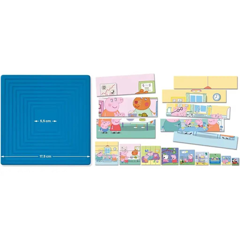 U kutiji ćeš pronaći 8 različitih scena iz popularnog crtića Pepa Prase, tako da se mališani iznova mogu igrati sa svojim omiljenim likovima. Puzzle su progresivne strukture: kreću od jednostavnijih slika s 2-3 dijela i napreduju do složenijih slagalica s više dijelova. To pomaže djeci da već na početku dožive uspjeh, a zatim postepeno povećavaju izazove.