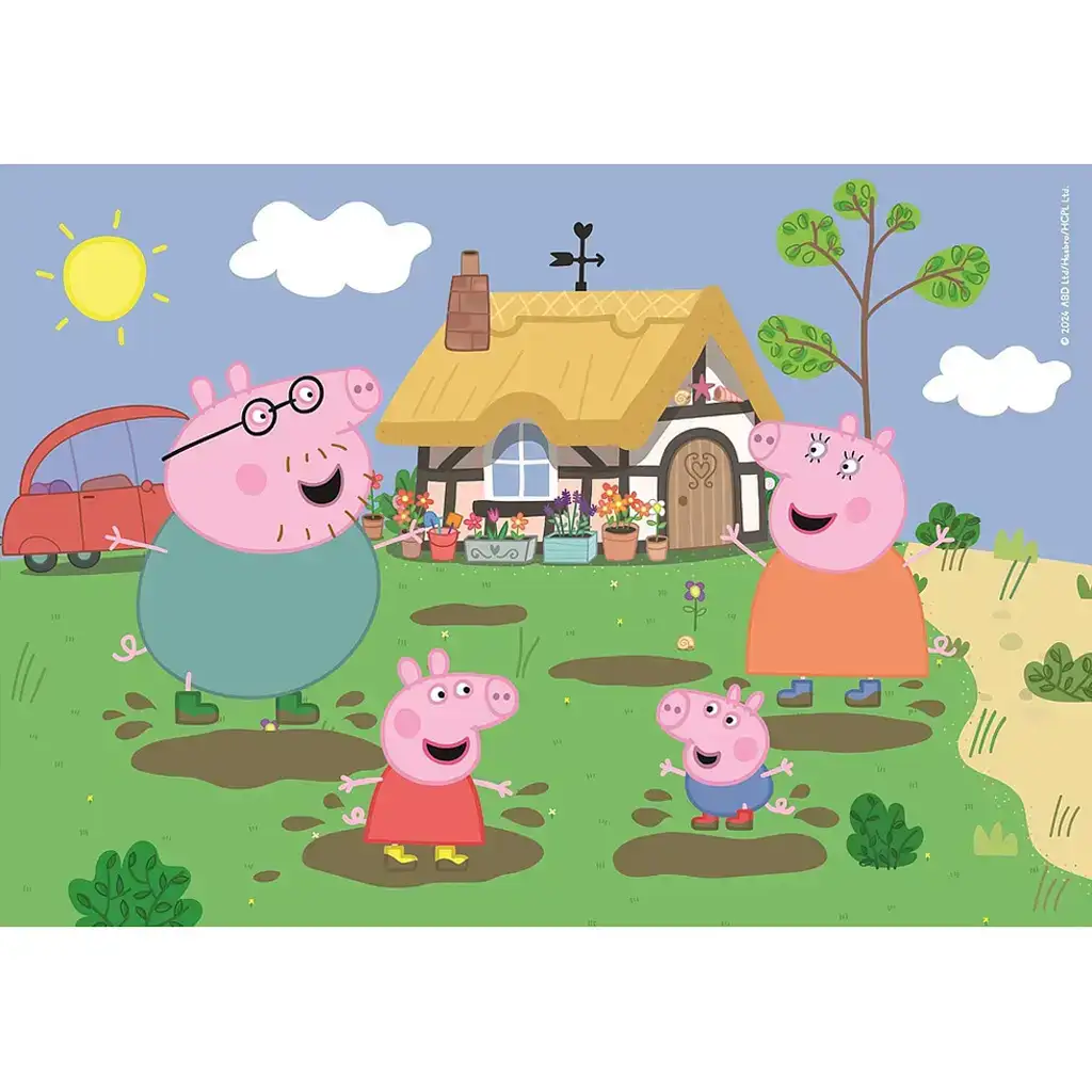 Omiljeni likovi iz crtića – Peppa, George, Mama i Tata Pig – prikazani su usred sunčane, blatne avanture, sretno prskajući po lokvama. Djeci je scena ne samo zabavna, već i poznata i draga, jer je to jedna od najikoničnijih scena iz crtića koja oživljava na dijelovima slagalice.