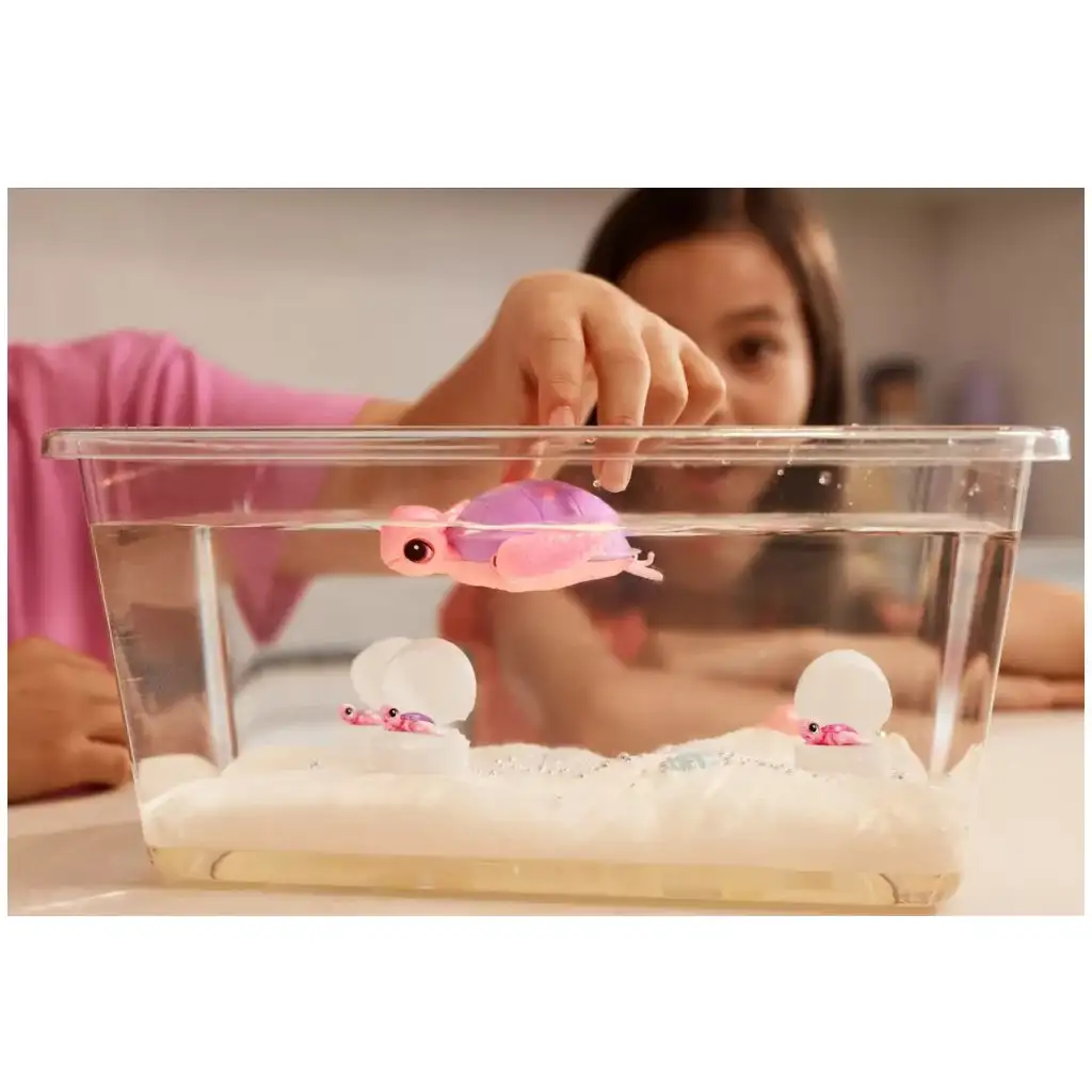 Velika mama kornjača glavna je zvijezda seta, koja oživi čim je staviš u vodu i zaista počne plivati. Samo napuni akvarijum vodom i možeš gledati kako se kornjača graciozno kreće kroz vodu. Ali ne zna samo plivati – hoda i po kopnu, tako da se djeca mogu brinuti o njoj i u vodi i na suhom.