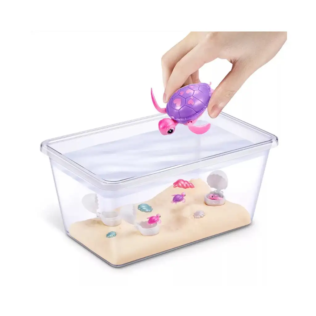 Set sadrži: 1 mama kornjača, 4 iznenađujuća jajeta (u njima 2–4 bebe kornjače), akvarij