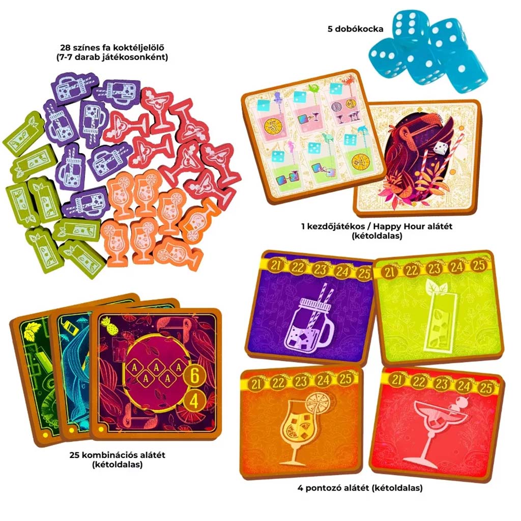 - Sadržaj kutije: 5 šestostranih kockica, 28 drvenih žetona za koktele, 30 podmetača, 1 priručnik s pravilima