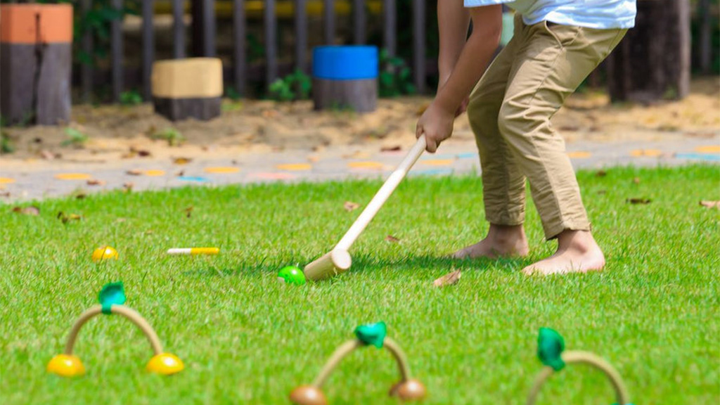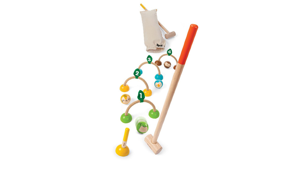 PlanToy Croquet set donosi održivi zaokret u klasičnu vanjsku igru. Mališani mogu naučiti igru s drvenim setom koji sadrži četiri loptice s temom životinja, dvije palice, četiri vrata i jedan završni stalak.