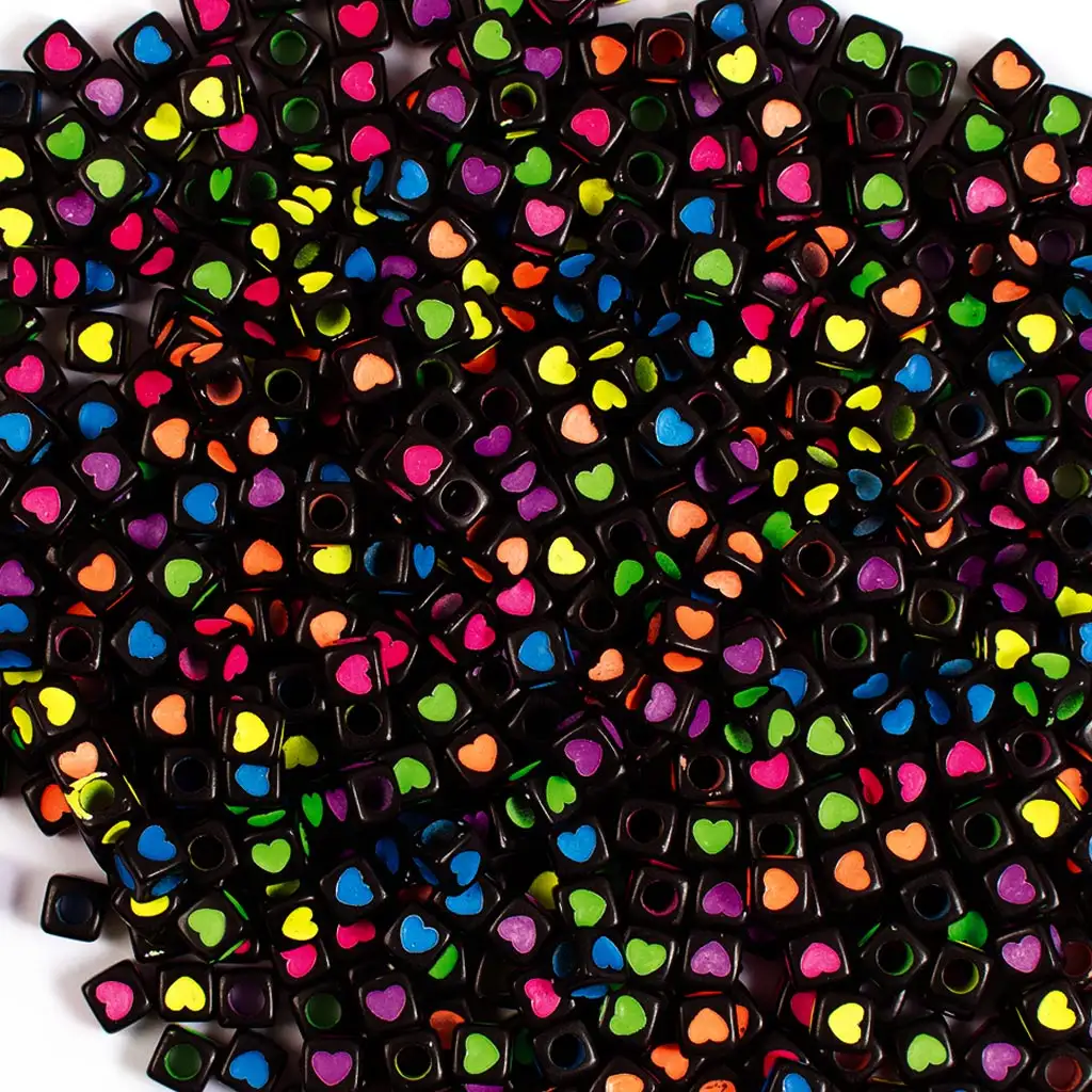 Ovaj set crnih plastičnih perli s uzorkom srca odličan je izbor za rukotvorine, izradu narukvica i ogrlica. Srca svijetle u neon bojama, stvarajući upečatljive i vesele dodatke.