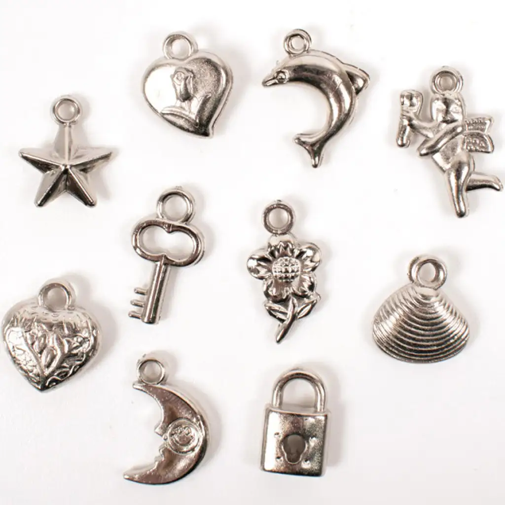 Različiti oblici – poput ključa, zvijezde, srca, dupina, mjeseca ili cvijeta – omogućuju da svaka kreacija bude jedinstvena i osobna. Bilo da želite izraditi narukvice prijateljstva, ogrlice za sreću ili vlastiti dizajn nakita, ovi privjesci pružaju izvrsnu osnovu.