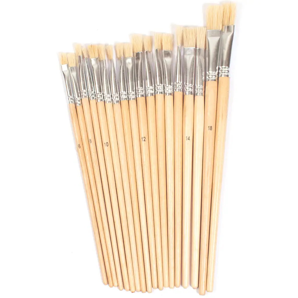 Set uključuje 18 ravnih četkica, svaka s drvenom drškom, što osigurava udobno držanje i kontrolu.