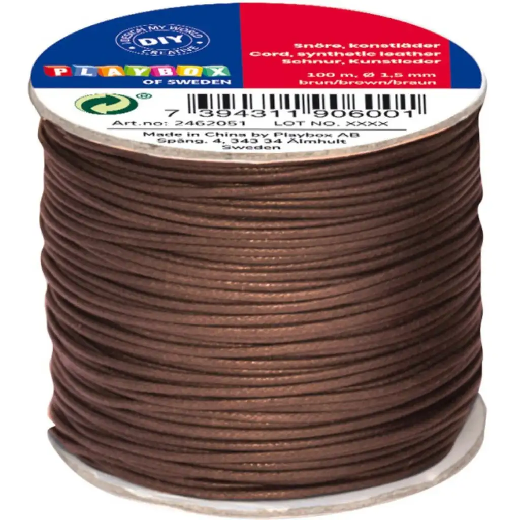 Upoznajte smeđu umjetnu kožnu vrpcu PlayBox, savršen izbor za svaki obrtnički projekt! Ova vrpca dužine 100 metara nudi obilnu količinu za realizaciju svih vaših kreativnih ideja. Promjer od 3,5 mm, izdržljivi materijal od umjetne kože je elegantan i robustan, stoga je posebno pogodan za izradu većih predmeta poput torbi ili košara, ali je odličan izbor i za nakit. Boja vrpce u smeđoj boji savršeno se uklapa u prirodne i zemljane kreacije, a također se odlično kombinira s drugim materijalima i bojama.