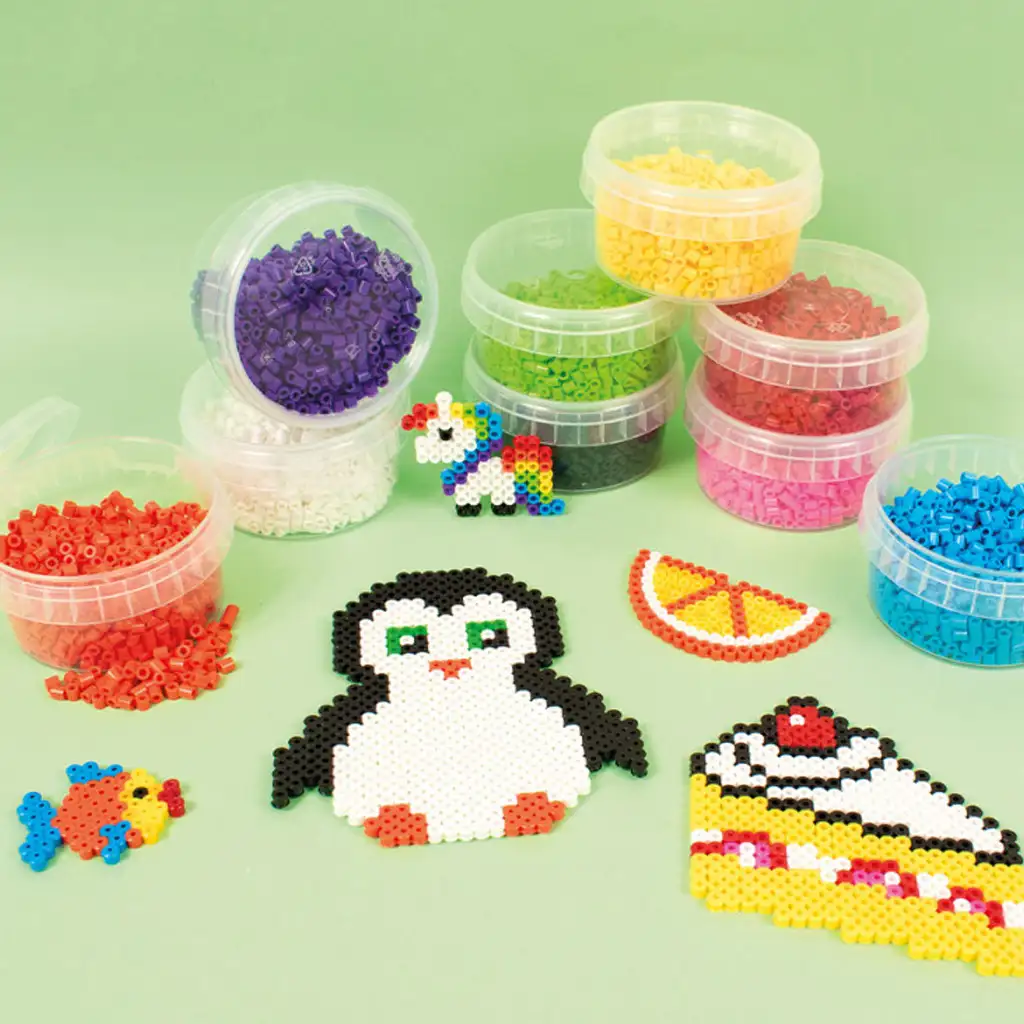Set sadrži bijele, crne, žute, crvene, plave, zelene, ljubičaste, narančaste i ružičaste perle, koje dolaze u praktičnim, ponovno zatvorivim plastičnim posudama, što ih čini lako organiziranim i pohranjenim. Veća veličina od 9 mm olakšava hvatanje i postavljanje perli, što ih čini idealnim izborom i za mlađu djecu.
