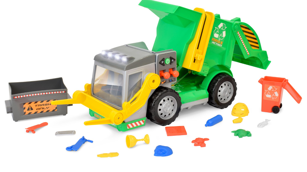Djeca mogu koristiti dvostruke joystick kontrolere za prikupljanje priloženih 15 komada smeća — prednji utovarivač podiže i ubacuje smeće na kamionsku platformu, odvojiva kanta se pomiče gore-dolje, a stražnja vrata se otvaraju kako bi ispraznila smeće. Djeca također mogu pomicati kamion naprijed i natrag.Ova igra nije samo zabavna, već razvija dječje "fino-motoričke vještine" i "koordinaciju". Kroz "kreativnu igru" djeca mogu naučiti važnost "zaštite okoliša" dok se dobro zabavljaju. Kamion je izrađen od "izdržljivih materijala", tako da mogu dugo uživati u igri.