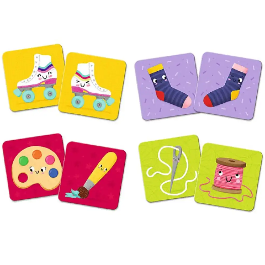 Ova memorijska igra ne temelji se na identičnim parovima, već na uparivanju odgovarajućih pločica, tako da par šiljila nije drugo šiljilo, već bojice, kao što je igla uparena s koncem, pa se mališani moraju još više koncentrirati. Nema drugog zadatka osim temeljitog miješanja pločica okrenutih slikom prema dolje, koje su lijepo raspoređene na stolu. Zatim početni igrač okrene dvije pločice, a svi zapamte što je bilo na slici prije nego što se one ponovno okrenu. Zatim je red na sljedećem igraču. Ako igrač uspješno pronađe par slika, dobiva ih i može ponovno pokušati. Pobjednik je onaj tko na kraju ima najviše parova slika u svojoj kolekciji.