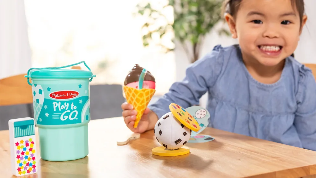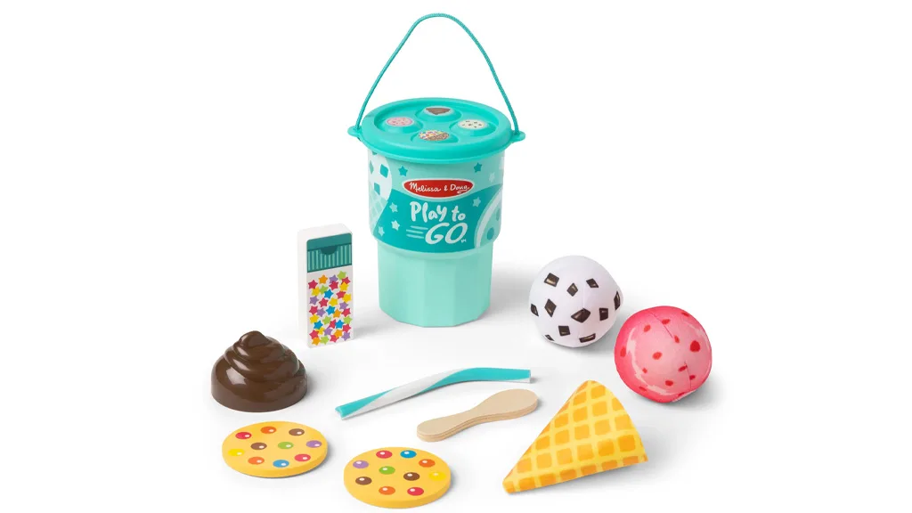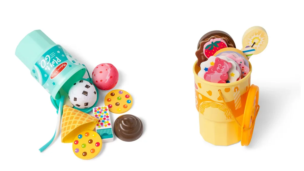 Melissa & Doug Play To Go Playsets su dizajnirani tako da djeca mogu ponijeti sa sobom na svoja putovanja i avanture. Cookies & Cake Playset sastoji se od 12 dijelova, uključujući tri sloja filca šećerne glazure, jednu košuljicu za cupcake, jednu dvosmjernu drvenu svijeću, tri dvosmjerna sloja kolača i torte, jednu drvenu jagodu i jednog drvenog gumijastog medvjedića. Među umjetnim okusima nalaze se čokolada, jagoda, vanilija i još mnogo toga.Set od 11 komada Sladoled Igračka uključuje dvije mekane, plišane kuglice sladoleda, jedan filc sladoledni kornet, plastični čokoladni preljev, spremnik s dvostranom posipom, prugastu plastičnu slamku, drvenu žlicu i dvije drvene kolačiće.