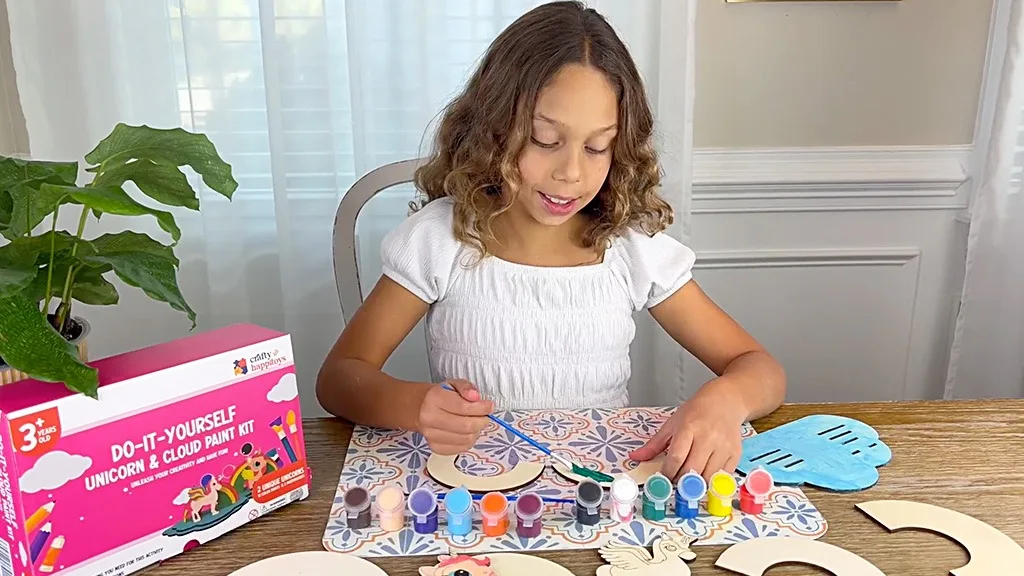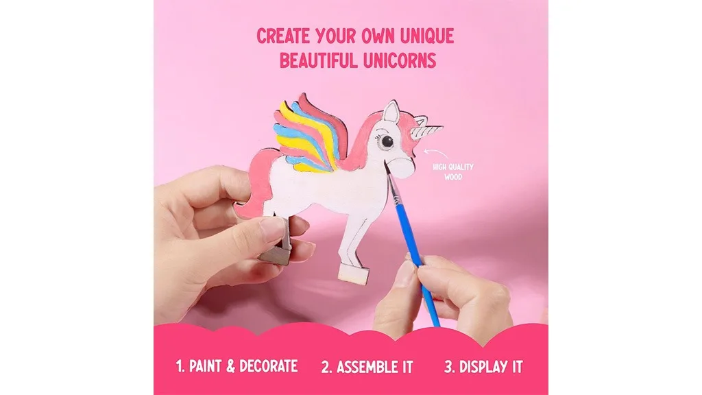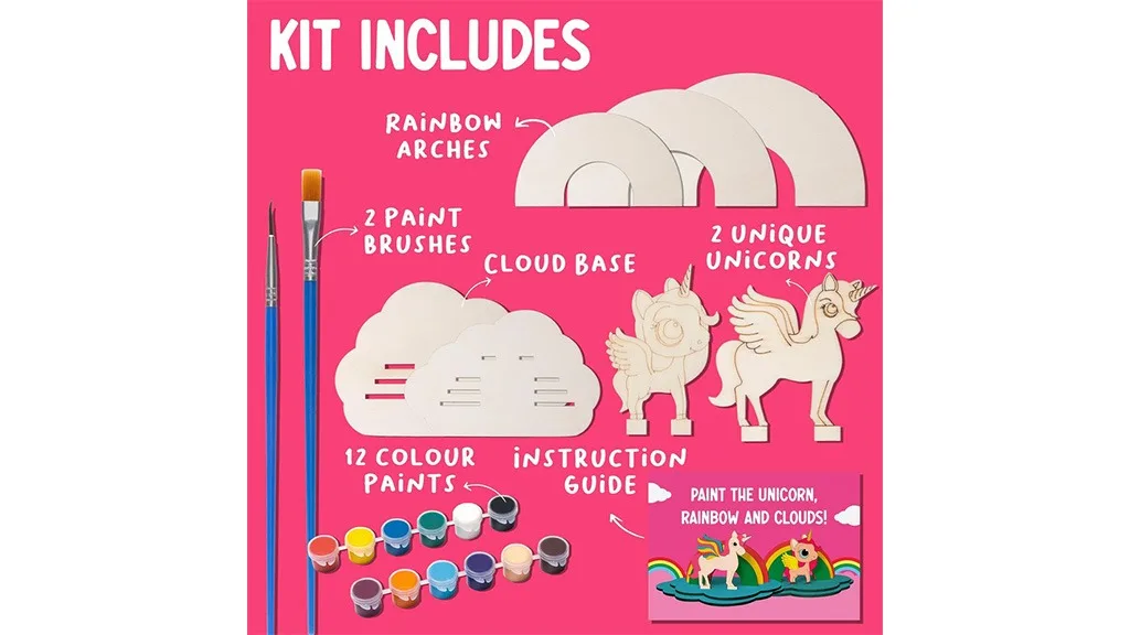 Učini-sam set za slikanje jednoroga i oblaka sadrži sve potrebne alate koji su djeci potrebni za stvaranje čarobnih kreacija, uključujući dvije diorame jednoroga, 12 netoksičnih boja i dvije četkice – jednu ravnu i jednu za detalje. Djeca mogu dodati jedinstvene dodire svojim jednorozima slijedeći tri laka koraka seta. Prvo, mladi umjetnici mogu ukrasiti svoje setove bilo kojom bojom. Sljedeći korak je čekanje da se boja osuši, što ne traje više od 15 minuta. Naposljetku, djeca sastavljaju dijelove jednoroga, oblaka i dugu kako bi stvorili dioramu – bez potrebe za ljepilom!