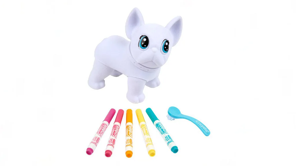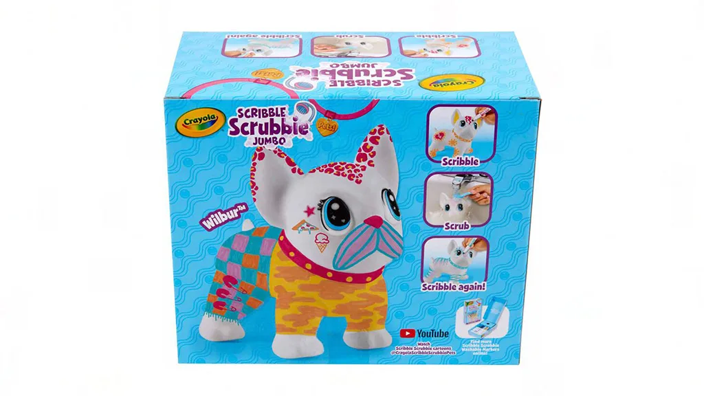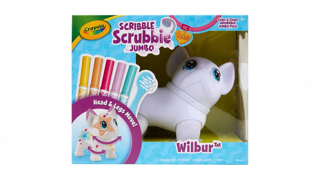 Crayola donosi Scribble Scrubbie igračku u novoj veličini s ovim ogromnim francuskim buldogom. Wilbur dolazi s posebnom četkom za čišćenje i pet netoksičnih markera u živim bojama: roza, narančasta, žuta, ljubičasta i plava. Visok je otprilike 15 cm i širok 7,5 cm, ovaj Scribble Scrubbie pas nudi obilje površine za dječje kreacije, a također ima pokretne glavu i noge, tako da može zauzeti bilo koju pozu. Djeca mogu crtati odjeću markerima, stvarati uzorke ili pisati priče na njegovom krznu. Kada su spremni za svježu paletu, samo ga operite vodom i gledajte kako boje nestaju!