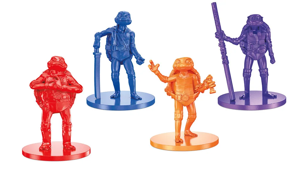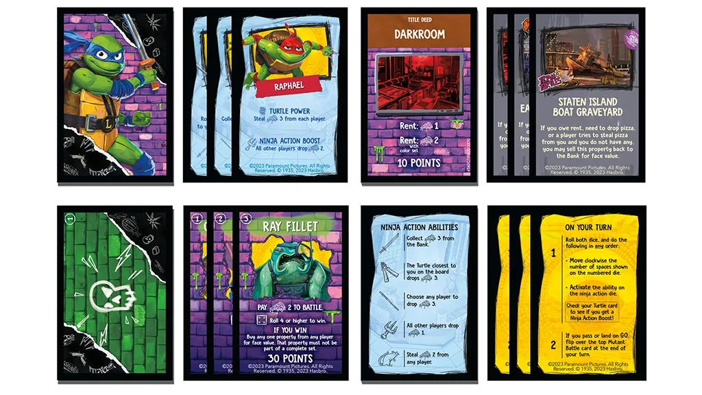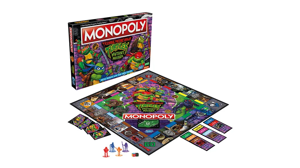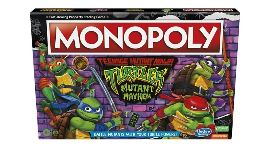Hasbro Monopoly igra pala je u kanalizaciju i pretvorila se u epsku novu igru! Ova verzija Monopolyja temelji se na Teenage Mutant Ninja Turtles: Mutant Mayhem, ikoničnom animiranom filmu koji je izašao prošle jeseni. Umjesto tradicionalnog Monopoly novca, igrači mogu kupovati nekretnine poput Kanalizacijskog Glavnog Stožera, Groblja Brodova na Staten Islandu i Kuglane, koristeći komade i kriške pizze. Ulogom Leonarda, Raphaela, Michaelangela ili Donatella, djeca se moraju boriti protiv opasnih mutanata svaki put kada prođu GO ili stanu na njega kako bi osvojili bonus bodove. Kada djeca bacaju ninja akcijske kockice zajedno s numeričkom kockicom, mogu aktivirati jedinstvenu ninja sposobnost koja im daje posebnu prednost. Igra završava kada se posljednja bitka s mutantima završi, a igrač s najviše bodova pobjeđuje!