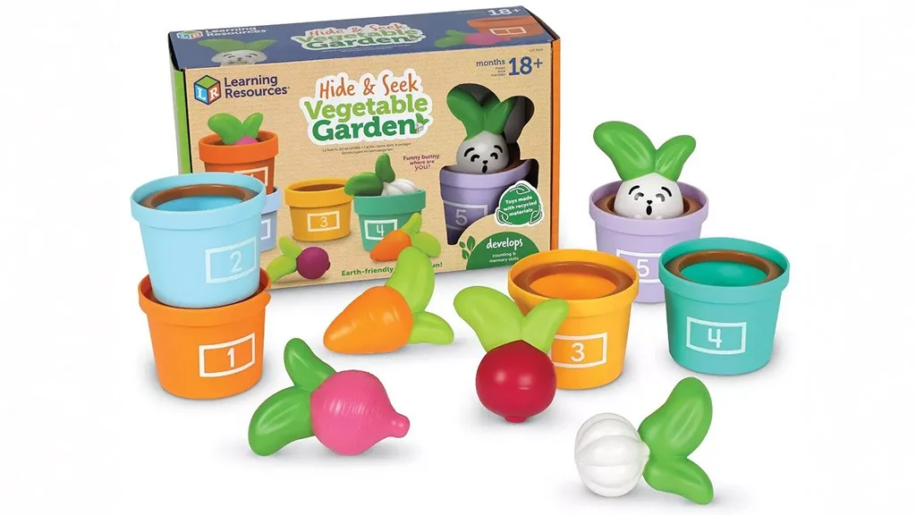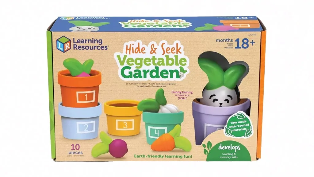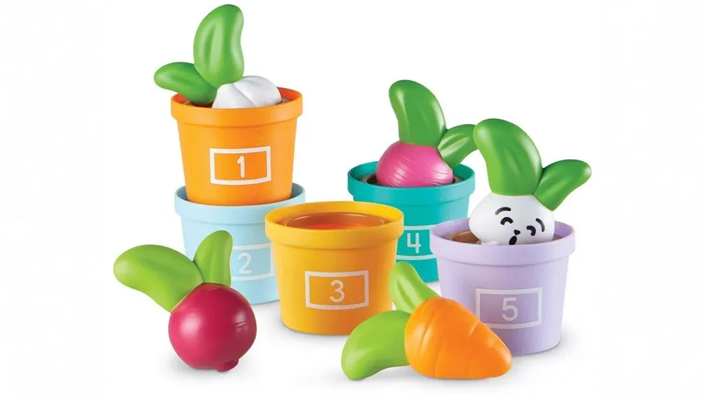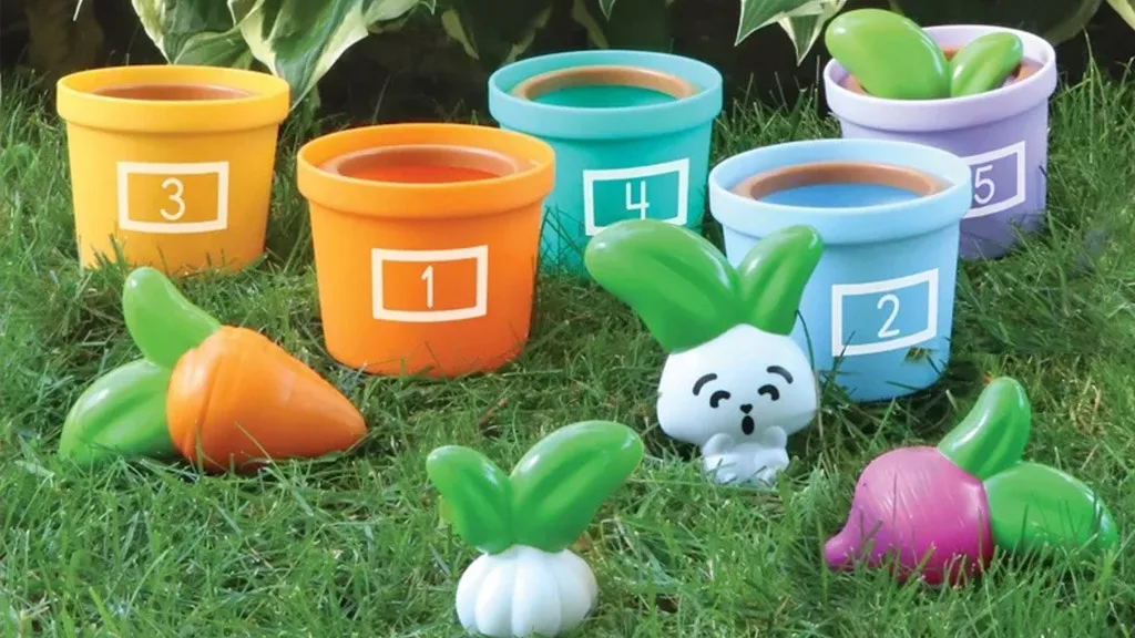 Vrt Zagonetki i Povrća je set od 10 igara koji potiče djecu da vježbaju brojanje, slaganje i sortiranje. Uključuje pet pastelnih, numeriranih lončića i gumene povrće, uključujući češnjak, mrkvu, ciklu i rotkvicu. Djeca mogu čak pronaći i prijatelja u petom lončiću: Zabavni Zeko!