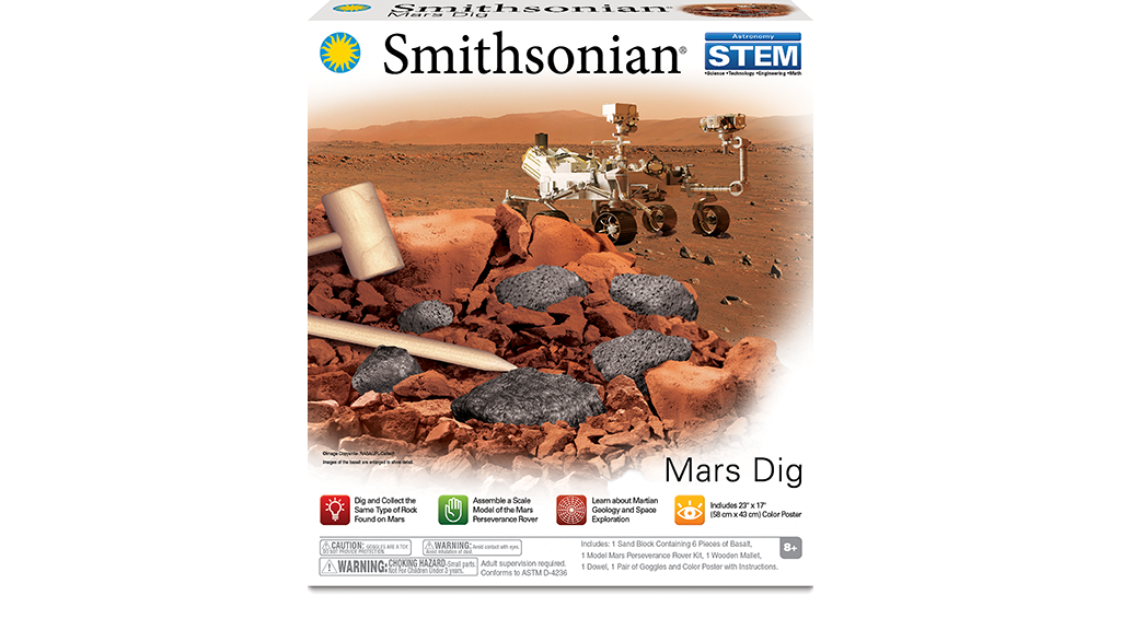 Smithsonian Mars Dig od NSI Internationala sadrži sve potrebne alate kojima djeca mogu istraživati stijene koje se mogu naći i na Marsu. Djeca starija od 8 godina mogu uklanjati pijesak iz bloka kako bi otkrila šest komada bazalta. Također mogu sastaviti svoj vlastiti model u mjerilu rovera Perseverance, koji je prikupljao uzorke stijena za povratak i proučavanje na Zemlji. Set uključuje i poster koji s jedne strane sadrži mnogo informacija, a s druge strane upute.Djeca uče mnoge STEAM koncepte kao što su geologija, istraživanje svemira, astronomija i mnogi drugi. Mogu čitati o roveru Perseverance i važnosti njegove misije, dok praktično i iskustveno upoznaju stijene i sedimente na Marsu. Sastavljanje rovera je jednostavno i brzo – dijelovi se jednostavno kliknu na mjesto, a djeca mogu proučavati komponente i upoznati njihove funkcije. Nakon što se "znanstveno istraživanje" (kopanje stijena) završi, djeca mogu dodati svoje nove stijene u svoju kolekciju!