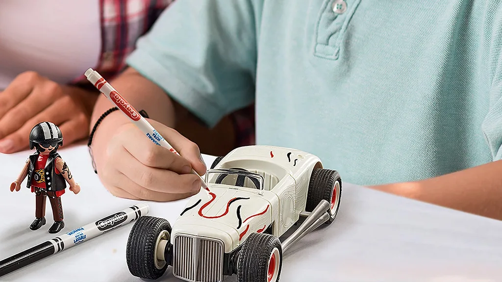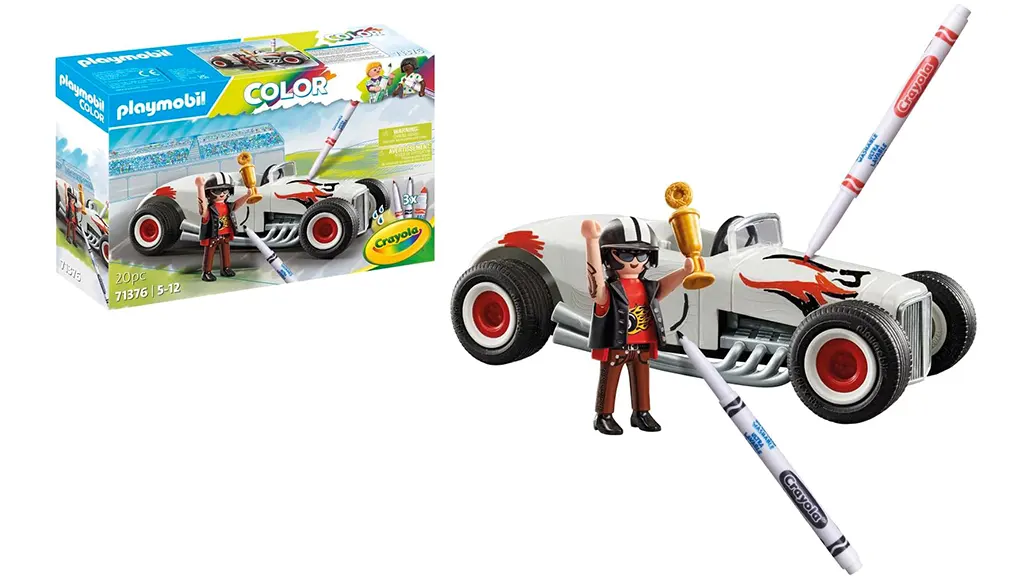 Djeca mogu iznova i iznova prilagoditi svoj trkaći automobil prema vlastitom ukusu. Ovaj Playmobil Color set uključuje Crayola flomastere koji su perivi, tako da mali trkači mogu ponovno dizajnirati svoj automobil. U paketu se nalazi i figura vozača, trofej, te spužva koja pomaže ukloniti boju ako je potrebno.