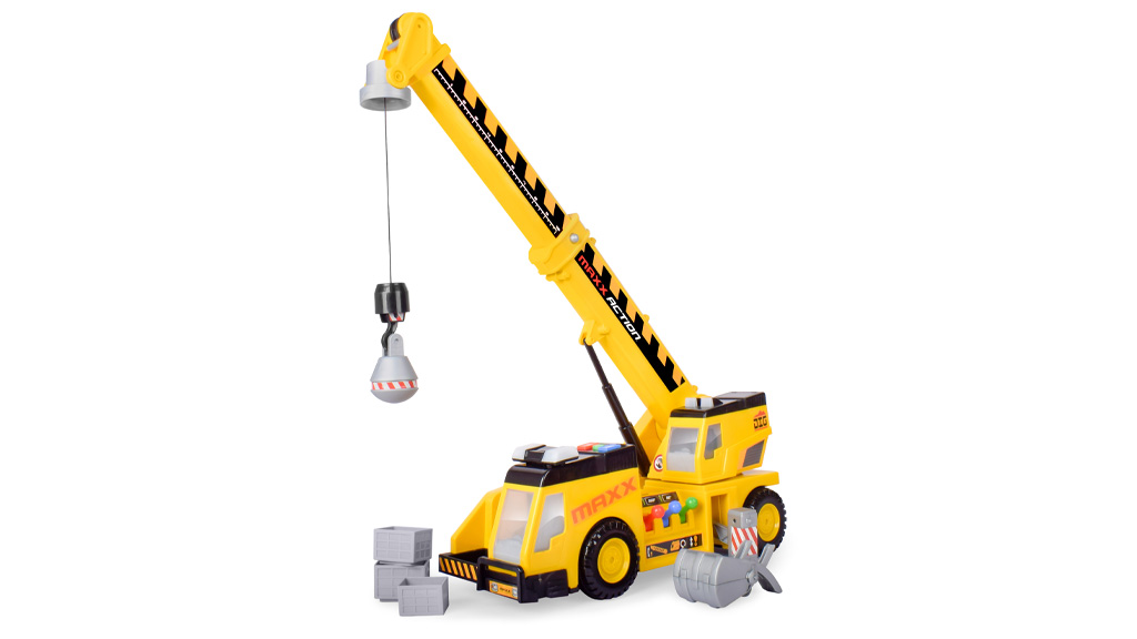Sunny Days Entertainment Maxx Action 3 u 1 kamion s dizalicom nudi 27 inča građevinske igre. Djeca mogu jednostavno koristiti joystick kontrole za podizanje, razbijanje i pomicanje građevinskih blokova! Kamion s dizalicom dolazi s tri dodatka — kašikom, kukom i kuglom za rušenje — tako da djeca mogu igrati na različite načine. Kamion s dizalicom rotira se za 360 stupnjeva, podiže do 30 inča i kreće se naprijed-nazad pritiskom na gumb. Također ima trepćuća svjetla i realistične građevinske zvukove.