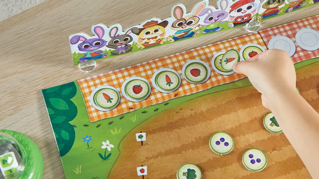 U ovoj igri koju je pripremio hand2mind, igrači zajedno rade kako bi 12 slatkih zečeva dobilo pravilan brunch narudžbu. Prvo, djeca biraju uzorak karticu i stavljaju je ispred zečeva. Zatim bacaju kocku da vide koje povrće mogu odabrati iz vrta da posluže zečevima. Ali moraju paziti i na gladnog miša koji pokušava zaustaviti ih na putu - moraju završiti uzorak prije nego što on pojede svu hranu. Ako to učine, igrači zajedno pobjeđuju u igri!