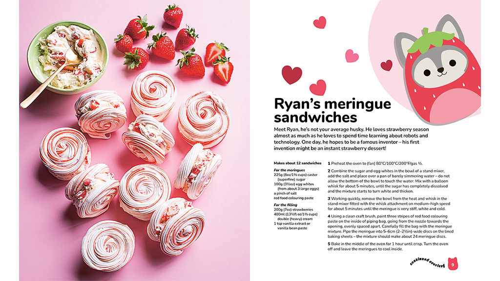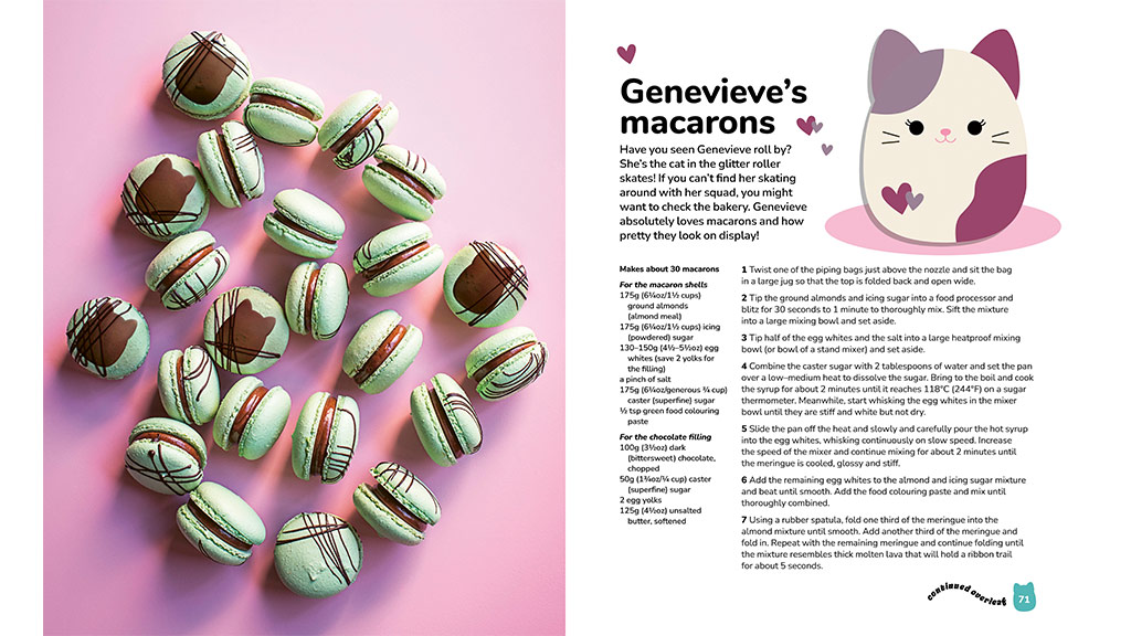 Squishmallows: Službena kuharica sadrži 50 recepata inspiriranih Squishmallowsima, koje djeca mogu pripremati zajedno s roditeljima. Među receptima se nalaze peciva, torte, keksi, slatkiši i pića koje cijela obitelj može pripremati tijekom cijele godine. Knjiga je neodoljiva jer sadrži primamljive fotografije svih recepata koje će djeci natjerati sline na usta. Među istaknutim receptima su Camovi trobojni kolačići, Hansovi čokoladni tartufi s posipom, Lesedine cimetne rolice, Bethanyni Linzer kolačići u obliku srca, Macove začinjene bundeve whoopie pite i još mnogo toga!