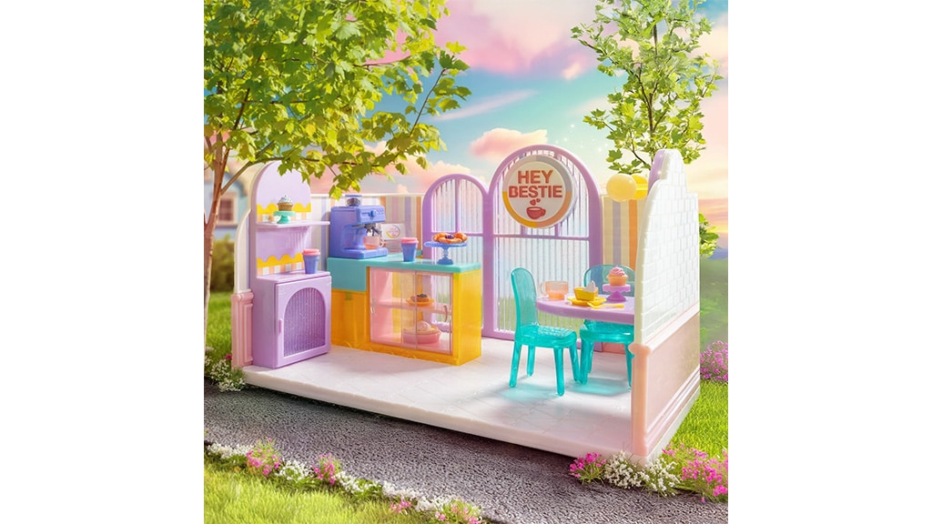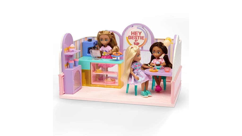 Ovaj set od 25 komada je moderan kafić za lutke Hey Bestie. Poslužite kavu i peciva u kafiću Hugs & Mugs. Set uključuje izložbeni pult i stol, 2 stolice, igračku espresso aparat, tablet, kao i dodatke za igračku hranu, poput peciva, šalica za kavu i pribora za jelo. Lutke se prodaju zasebno.