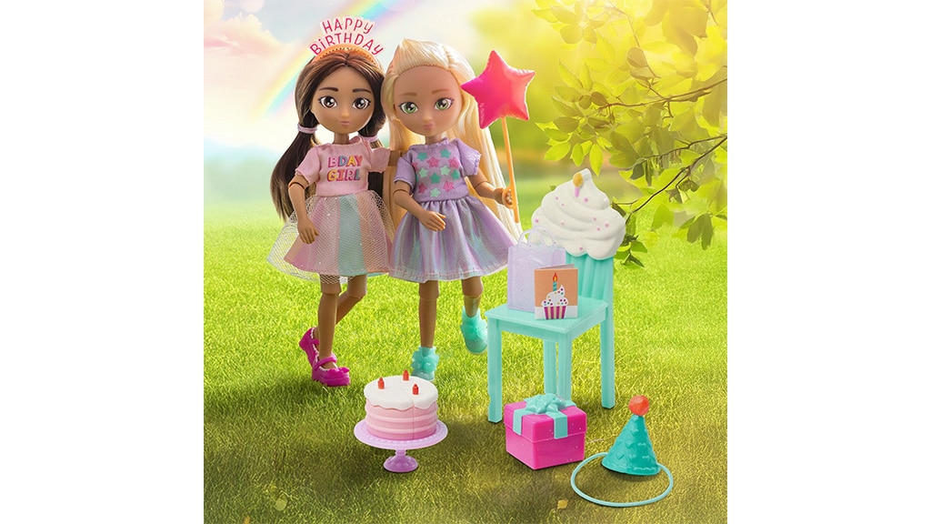 Ove dvije lutke prijateljice dolaze s preslatkim setom dodataka za rođendansku zabavu. Ove lutke imaju kosu koja se može češljati. Njihov dizajn s kuglastim zglobovima omogućuje savijanje na vratu, ramenima, laktovima, kukovima i koljenima. Lutke su izrađene s posebnim detaljima kako bi djeca još više uživala u igri. Među dodacima se nalaze šareni baloni, torta i male poklon kutije, koje čine rođendansku zabavu još uzbudljivijom.