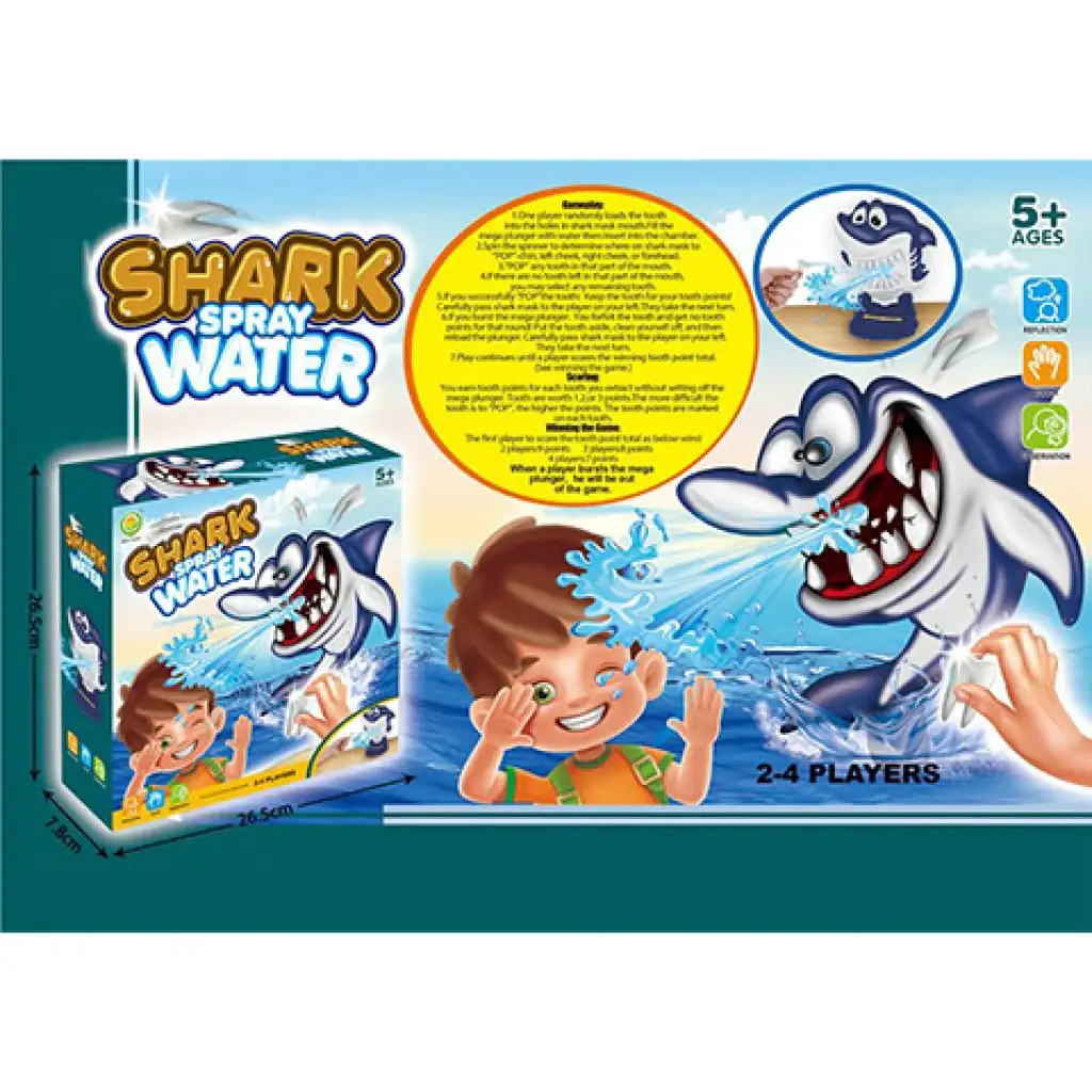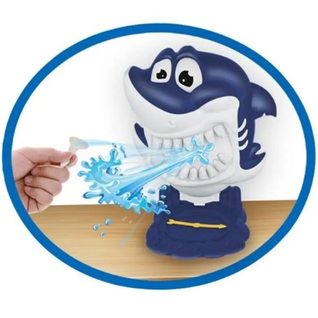 Cilj društvene igre Prskajući morski pas je da igrači izvlače zube plavog morskog psa bez da ih slučajno poprskaju vodom, jer tada ispadaju iz igre. Pripreme su vrlo jednostavne, umetnite špricu napunjenu vodom na odgovarajuće mjesto, stavite gumene zube jedan po jedan u usta morskog psa i igra može početi!