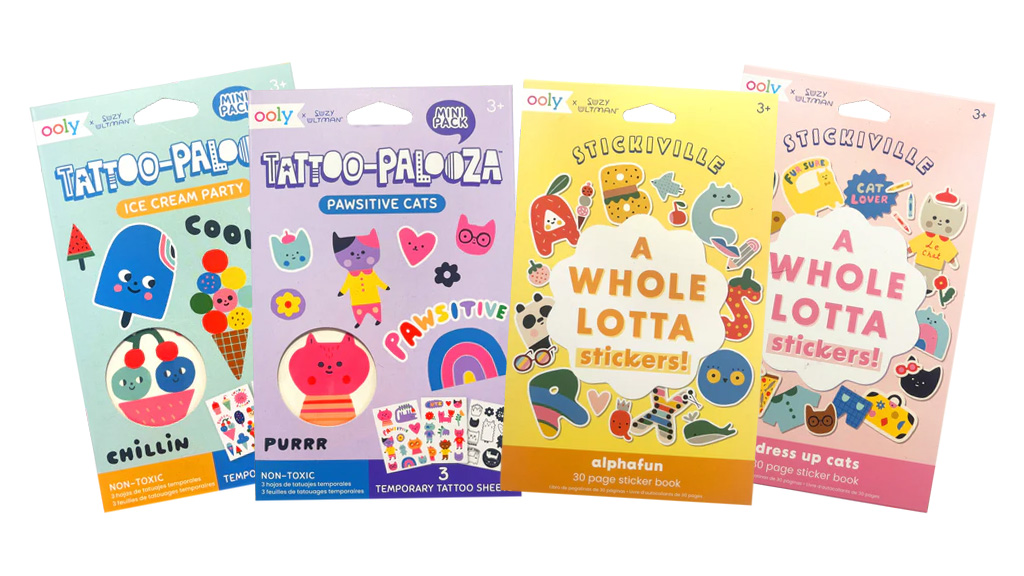 Umjetnica i ilustratorica, Suzy Ultman, dizajnirala je ove naljepnice i privremene tetovaže. Bilo da dijete želi stvarati s mačkama ili želi tetovažu sladoleda, ova kolekcija sadrži odgovarajuću knjigu s naljepnicama ili paket privremenih tetovaža za njih! Žive boje i detaljni uzorci naljepnica i tetovaža zajamčeno će privući pažnju i kreativnost djece. Savršen izbor za rođendanski poklon ili bilo koju posebnu prigodu.