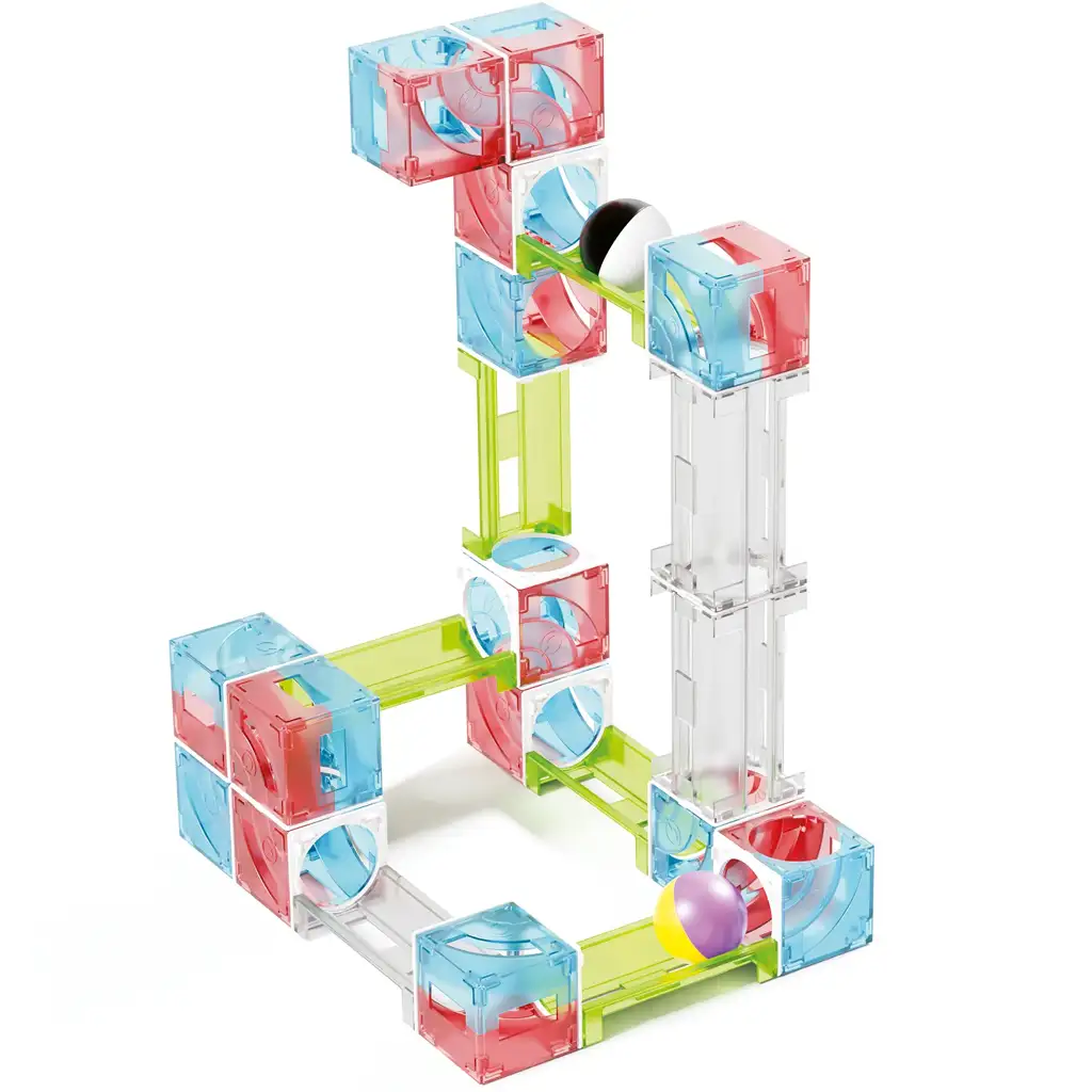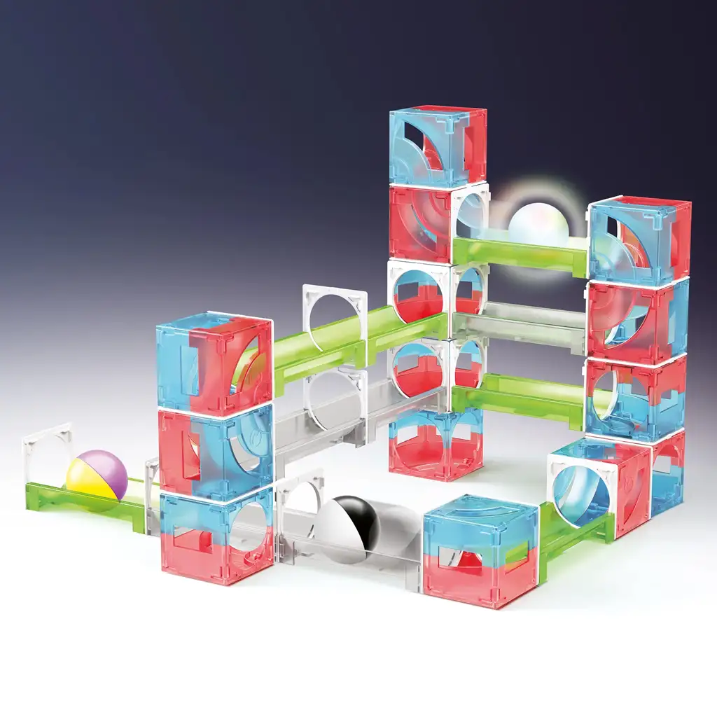 Set uključuje i kuglicu koja svijetli – ona automatski zasvijetli tijekom kretanja, pa je igra u večernjim satima još spektakularnija. Kuglice su u raznim bojama i uzorcima, pa igra vizualno pruža dodatno uzbuđenje. Kvalitetni, prozirni plastični elementi čvrsto se uklapaju jedan u drugi, a šarene kocke lako se sastavljaju i rastavljaju, čak i za manje ruke.