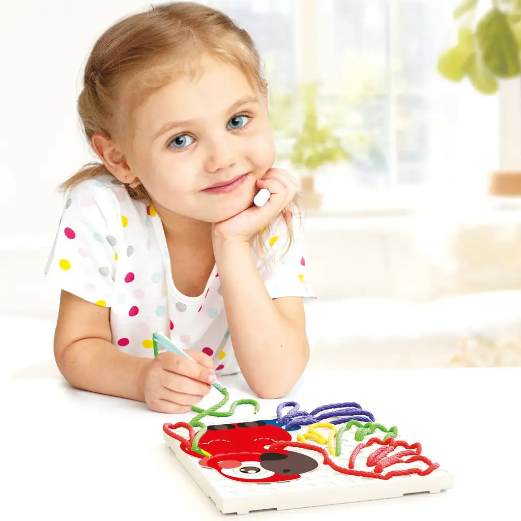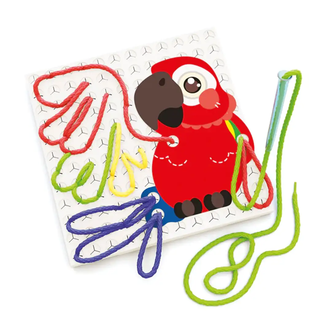 Suština igre je da postaviš predloške na ploču s rupama, a zatim provučeš niti kroz rupe na predlošcima, tako iscrtavajući predloške. Ovaj set sadrži uzorke povezane sa životinjama, pa tako možeš pronaći žirafu, gusjenicu i papigu.