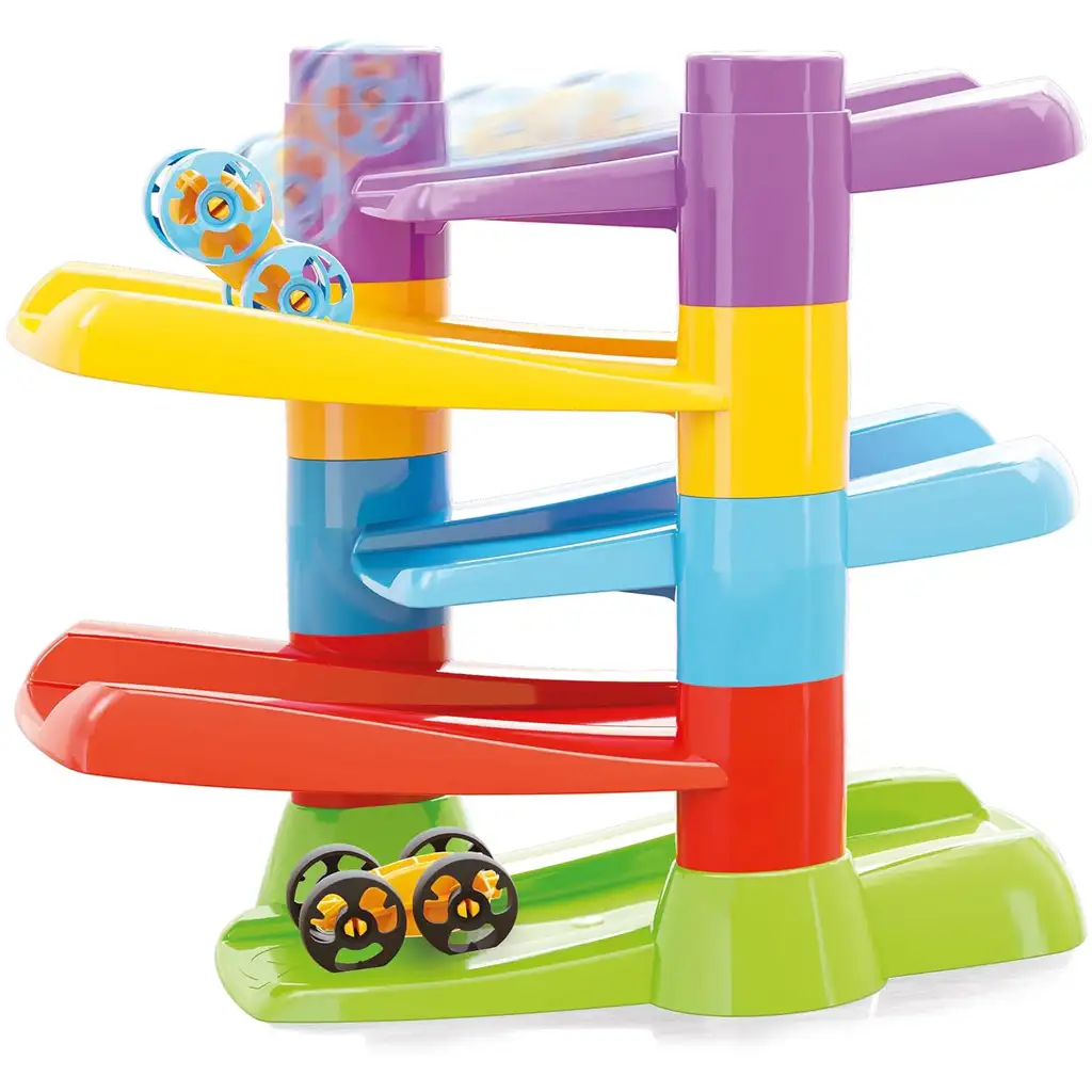 Set sadrži šarenu trkaću stazu s pet rampi i dva specijalna flip car automobila. Jedinstvena konstrukcija automobila omogućuje im da se samostalno okreću nakon svake rampe, čime ostaju u stalnom pokretu. To pomaže djeci da razumiju uzročno-posljedične veze, kao i da razvijaju vizualne sposobnosti praćenja i koncentraciju.