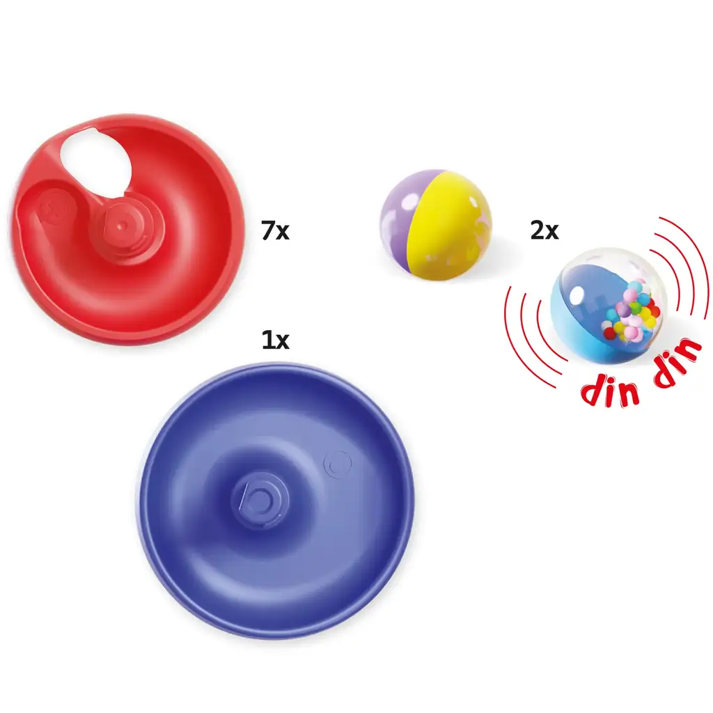 Set sadrži 7 spiralnih staza, stabilno postolje i 2 kuglice – jedna od njih je šarena zvečkajuća kuglica koja tijekom kretanja proizvodi zvuk, čime dodatno pojačava doživljaj. Druga loptica privlači pažnju bebe svojim kontrastnim šarenim uzorkom, potičući opažanje. Kula se lako sastavlja, dijelovi čvrsto prianjaju jedan za drugi, a tijekom igre ne razvijaju se samo pokreti ruku već i razumijevanje uzročno-posljedičnih odnosa kod djece.