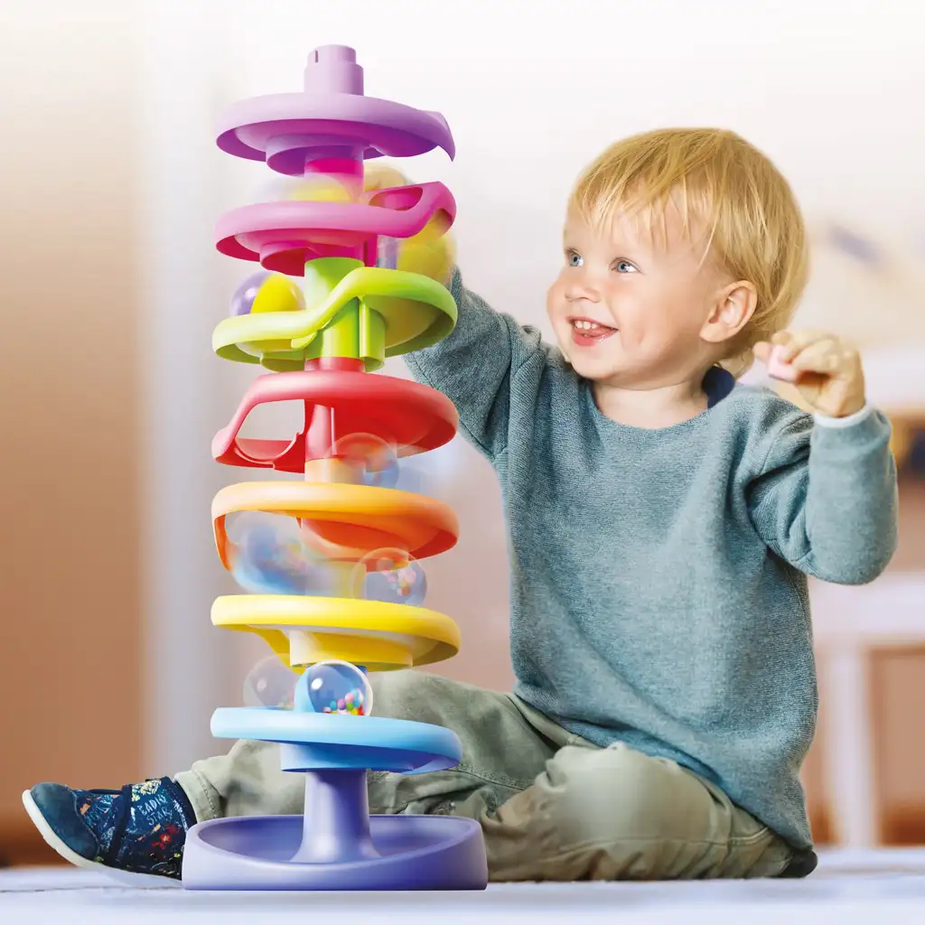 Kroz igru bebe doživljavaju kako se predmeti kreću pod utjecajem gravitacije i s oduševljenjem prate kako kuglica sve brže kotrlja na svakoj razini. Igračka je tiha, ali dovoljno zanimljiva da joj se mališani uvijek iznova vraćaju – a zvuk zvečkajuće kuglice nije naporan, već ugodno zaokuplja pažnju.