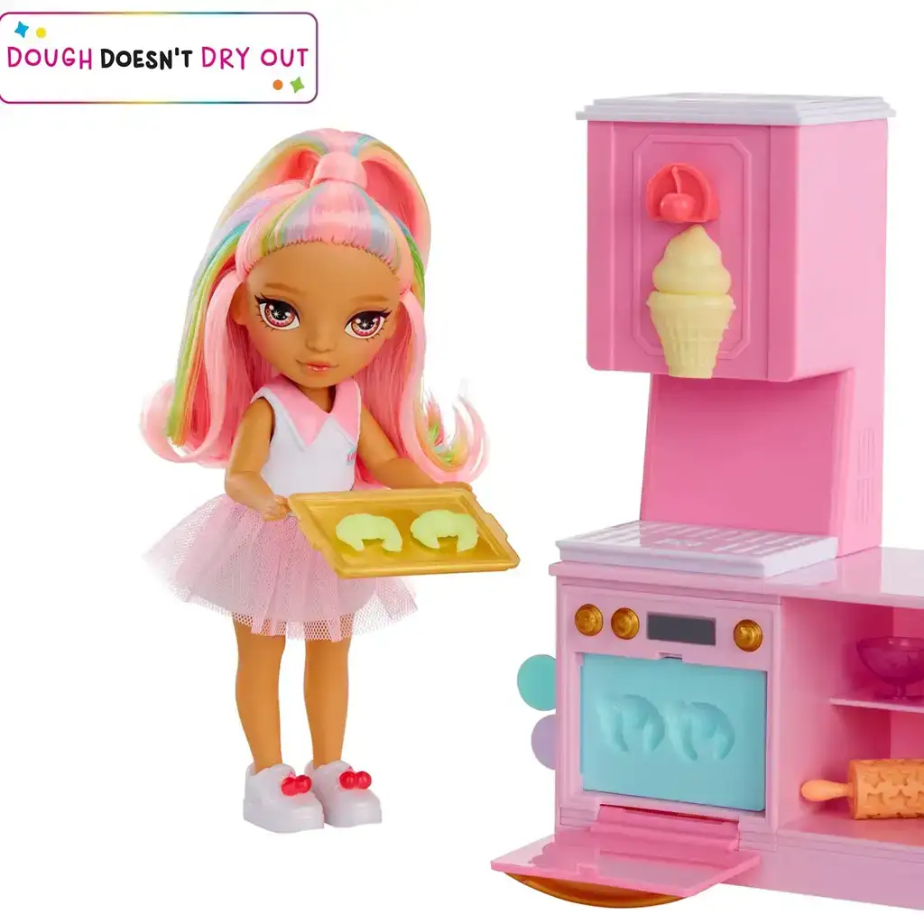 Rainbow High Slatki dućan igraći set donosi čarobno iskustvo slastičarnice za djecu, gdje mogu sama izrađivati slatkiše i uz pomoć šarmantne male slastičarke, Kandy Hart, otkriti svijet pečenja i dekoracije. Ovaj set je savršen za djecu koja vole stvarati i obožavaju šarene, bajkovite dodatke.
