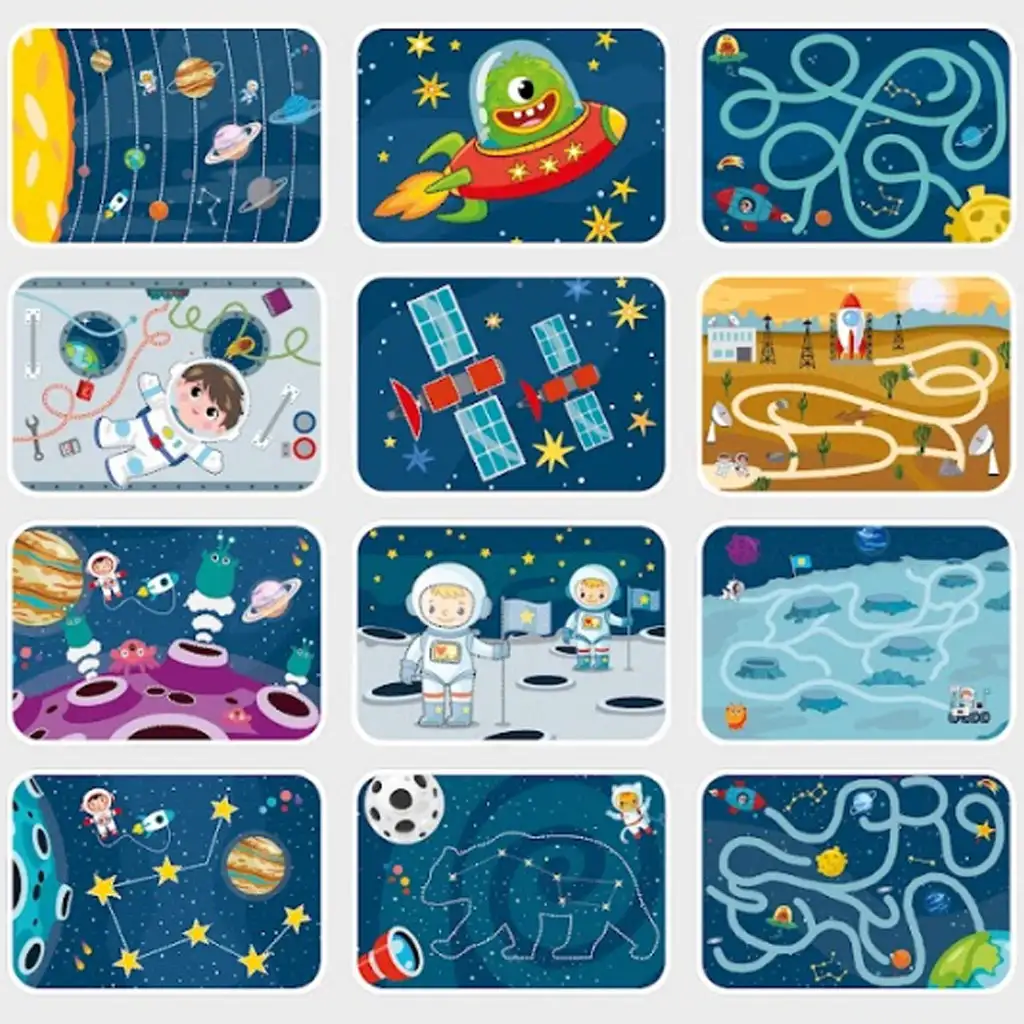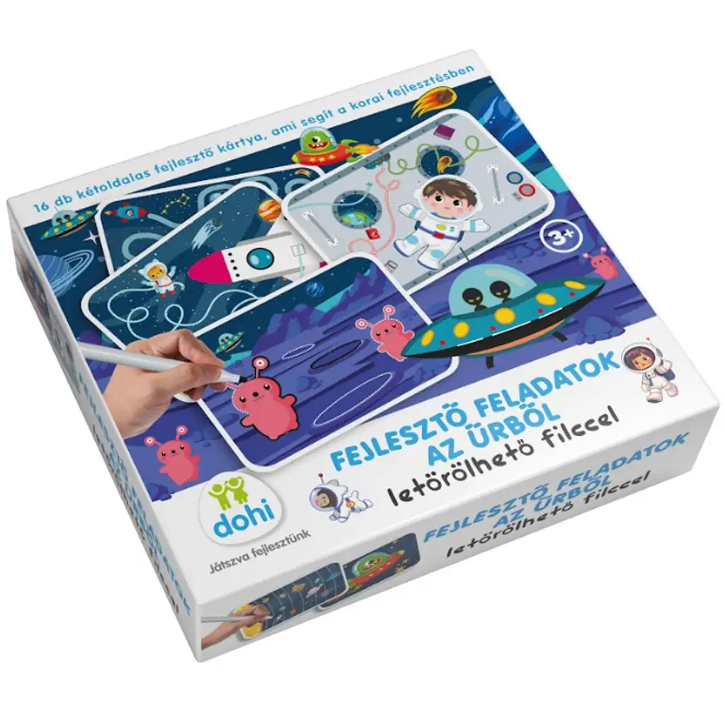 Paket sadrži 16 dvostranih kartica, punih raznolikih zadataka kao što su labirinti, povezivanje točaka, vježbe vođenja linija i dopunjavanje uzoraka. Zahvaljujući brisivom flomasteru, djeca mogu iznova i iznova rješavati zadatke, što osigurava dugotrajnu upotrebu i beskrajno igračko iskustvo. Veseli, svemirski povezani crteži na karticama, poput astronauta, vanzemaljaca i raketa, zasigurno će potaknuti dječju maštu.