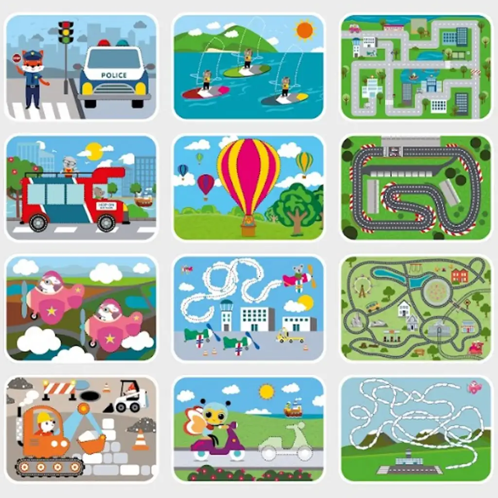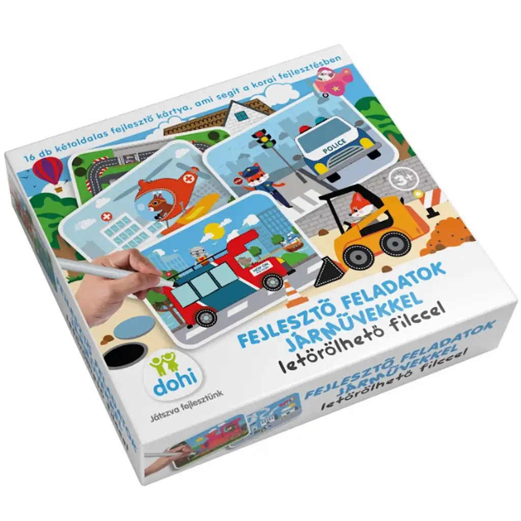 U paketu se nalazi 16 dvostranih razvojnih kartica, svaka s uzbudljivim i šarenim zadacima za djecu. Kartice nude razne zadatke, poput vođenja linija, traženja puta, spajanja točaka i traženja razlika. Uz priloženi brisivi flomaster, djeca mogu neograničeno ponavljati igre, što set čini dugotrajnim izvorom zabave. Tema vozila, bilo da se radi o vozilima hitne pomoći, avionima ili trkaćim stazama, zasigurno će biti uzbudljiva i inspirativna za male ljubitelje prometa.