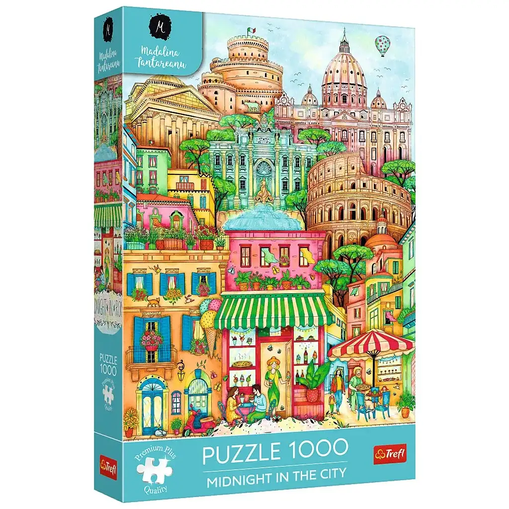 Otkrij čari Vječnog grada uz ovu posebnu, 1000-dijelnu slagalicu jedinstvene atmosfere, koja prikazuje najpoznatije znamenitosti Rima u bajkovitom i osebujnom stilu Mădăline Tănăsăreanu. Slagalica „Rim u ponoć” prava je eksplozija boja koja istovremeno dočarava povijesnu ljepotu grada i njegov mediteranski duh. Na slici su prepoznatljivi Koloseum, bazilika sv. Petra, Fontana di Trevi, Anđeoska tvrđava, kao i mnoge šarmantne talijanske ulice pune cvijeća, štandova sa sladoledom, kafića i romantičnih balkona.