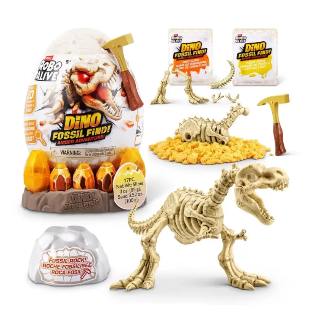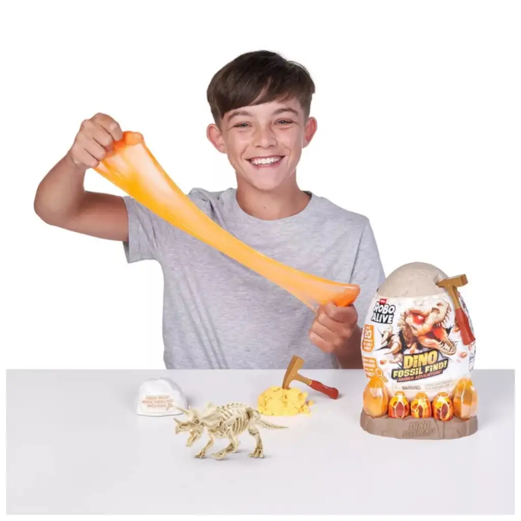 Otkrij tajne prošlosti s Robo Alive dinosaurusovom fosilijom – Jantarna avantura setom! Pripremi se za uzbudljivo iskapanje, gdje se moraš probiti kroz slojeve stijena i pijeska dok ne otkriješ drevne ostatke dinosaura. Slime-lava je poseban dodatak u ovoj avanturi: svijetli, rasteže se i čini istraživanje još zabavnijim.