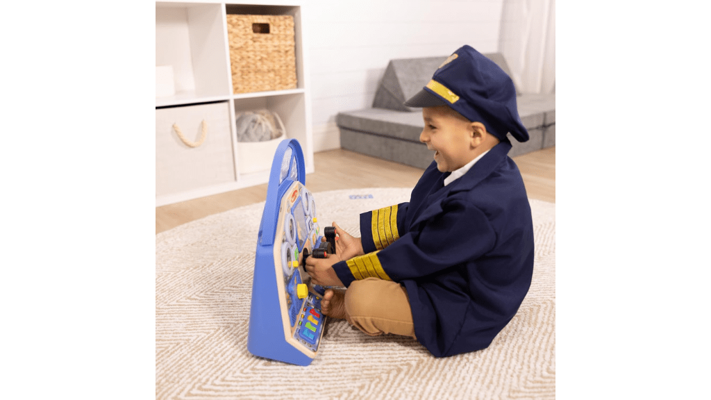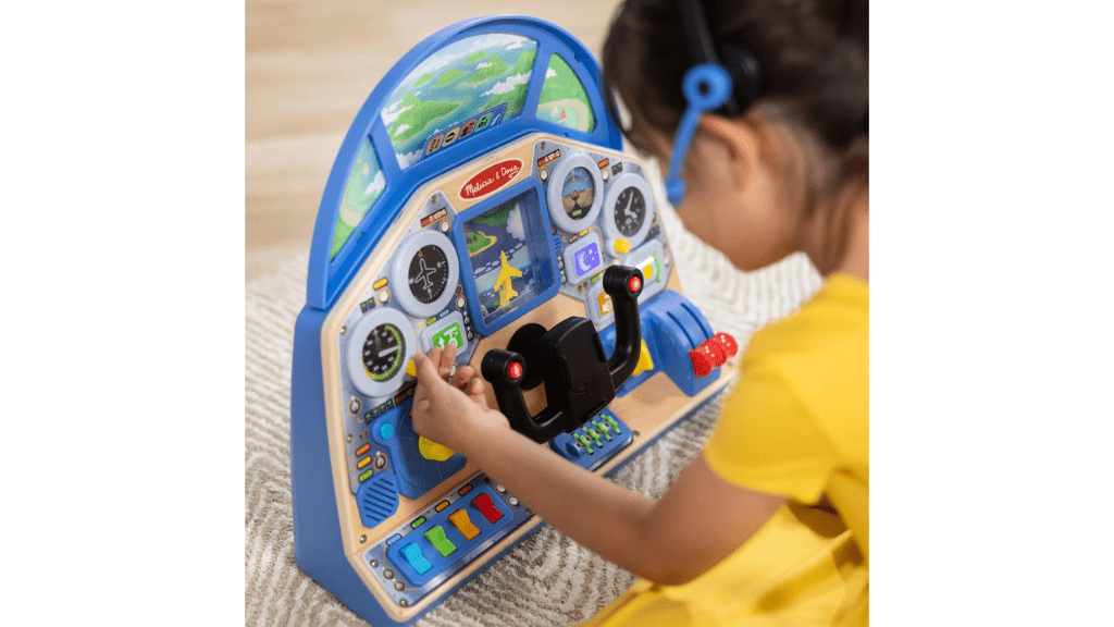 Melissa & Doug Jet Pilot Dashboard.Budući piloti mogu se pripremiti za polijetanje s ovom interaktivnom pločom instrumenata koja sadrži svjetla, gumbove, reprodukciju zvuka, četveropoložajnu ručicu gasa i još mnogo toga. Djeca mogu okretati upravljački krug kako bi pomicali mini zrakoplov na pomičnom zaslonu.