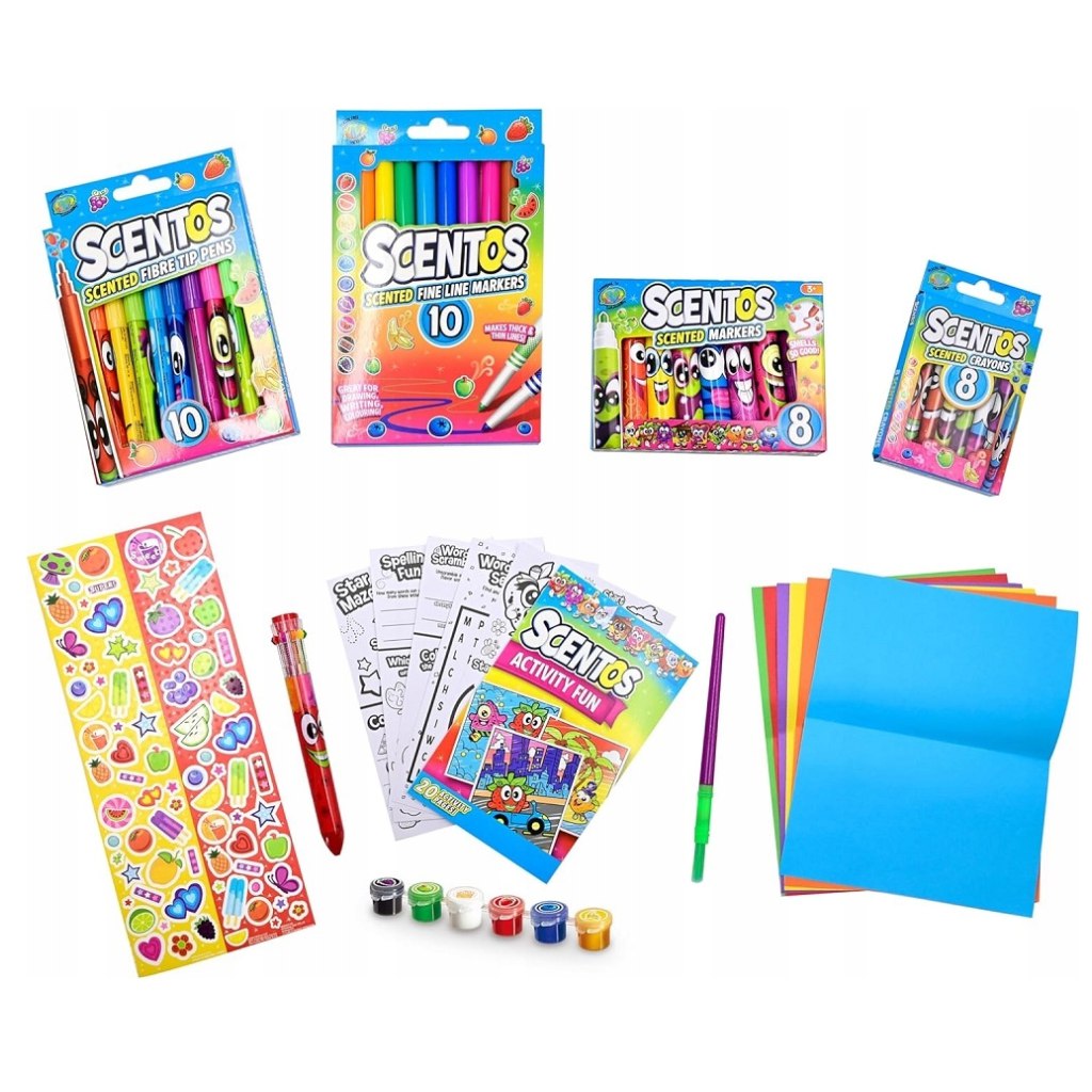 Scentos Mega set za aktivnosti je zaista svestran kreativni komplet koji će djecu zabaviti satima. Posebnost seta je što su alati ne samo šareni, već i mirisni, što iskustvo stvaranja čini još uzbudljivijim. Pomoću raznih flomastera, voštanih bojica, boja i dodataka djeca mogu slobodno razvijati svoju maštu, dok istovremeno na zabavan način razvijaju finu motoriku i kreativnost.
