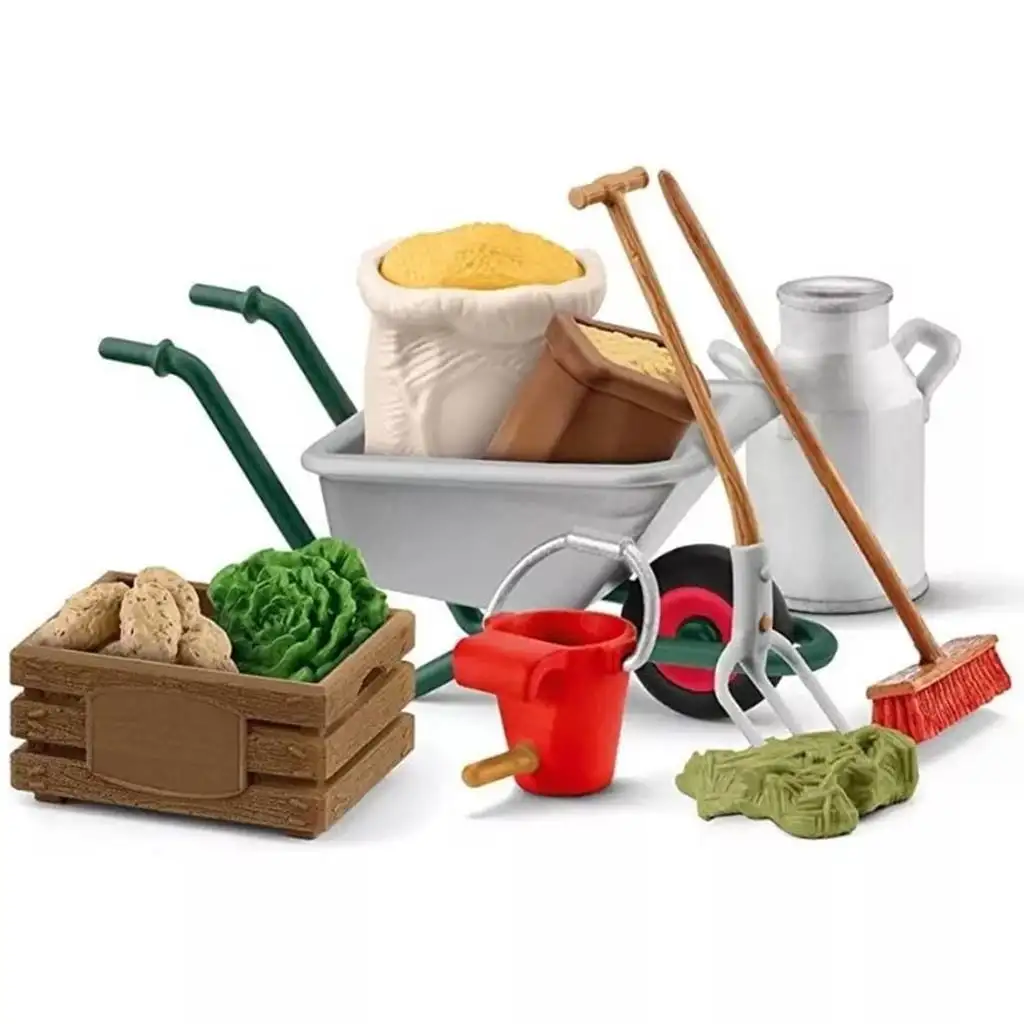 Set uključuje izdržljivu kolica u koju se mogu staviti vreće sa žitaricama i sijenom, omogućujući djeci da se igraju procesa hranjenja životinja. Svježa hrana za životinje osigurana je kutijom s povrćem u kojoj se nalaze krumpir i salata. Za svakodnevnu njegu farme potrebna je metla i vile, koje su također uključene u set. Ovim alatima djeca mogu igrati kako čiste staju i osiguravaju čist i udoban okoliš za životinje.