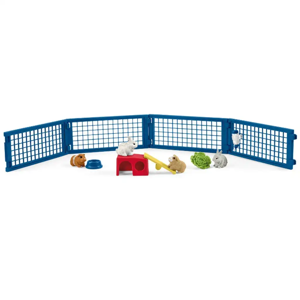 Ograđeni prostor dovoljno je prostran da zečevi i zamorci mogu veselo skakati, istraživati teren ili se sakriti u maloj kućici. Set uključuje jednog zeca, dva zamorca, zdjelu za hranjenje, list salate, crvenu kućicu za skrivanje, žutu klackalicu i plavu ogradu, pružajući djeci bezbroj mogućnosti za igru.