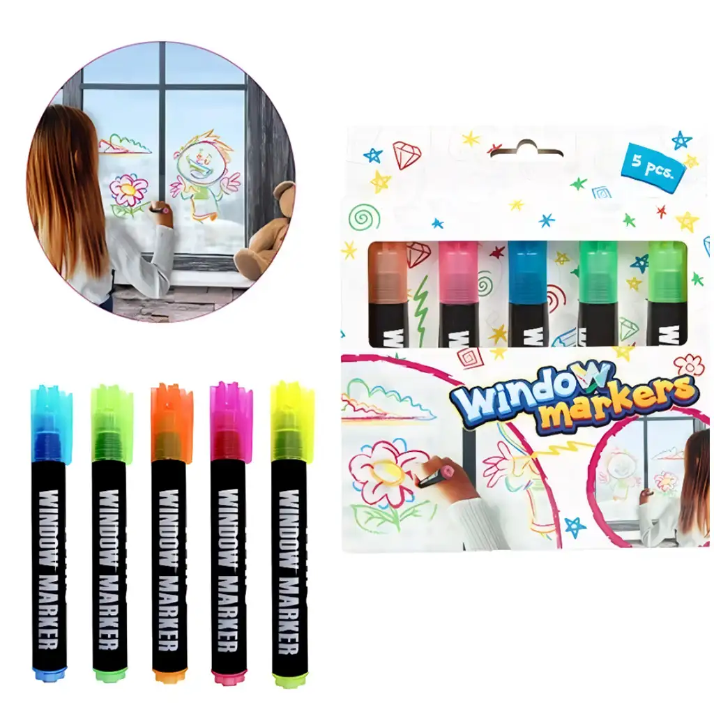 Set od 5 komada markera za staklo nudi kreativnu zabavu za djecu koja vole ukrašavati svoju okolinu i izražavati se crtanjem. Ovi posebni markeri su dizajnirani posebno za staklene površine, poput prozora, ogledala ili čak čaša, tako da mališani mogu uljepšati različite dijelove doma veselim, šarenim uzorcima. Set sadrži pet živih boja – zelenu, plavu, ružičastu, narančastu i žutu – koje su žive i dobro vidljive, omogućujući djeci da lako stvaraju upečatljive kreacije.