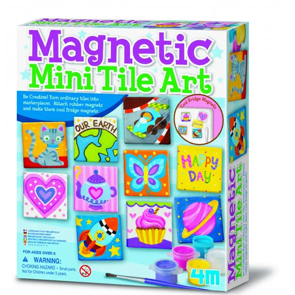 Oslobodi kreativnost svog djeteta s ovim super zabavnim setom za izradu magnetskih ukrasa za hladnjak! 4M Magnetic Mini Tile Art omogućuje djeci da stvore vlastite, jedinstvene magnete za hladnjak na pločicama veličine keramičkih pločica – s raznobojnim, simpatičnim i smiješnim motivima, ili čak potpuno vlastitim idejama. Set sadrži sve potrebne alate za umjetničko stvaranje: kist, boje, magnetske podloge i, naravno, male pločice za oslikavanje.